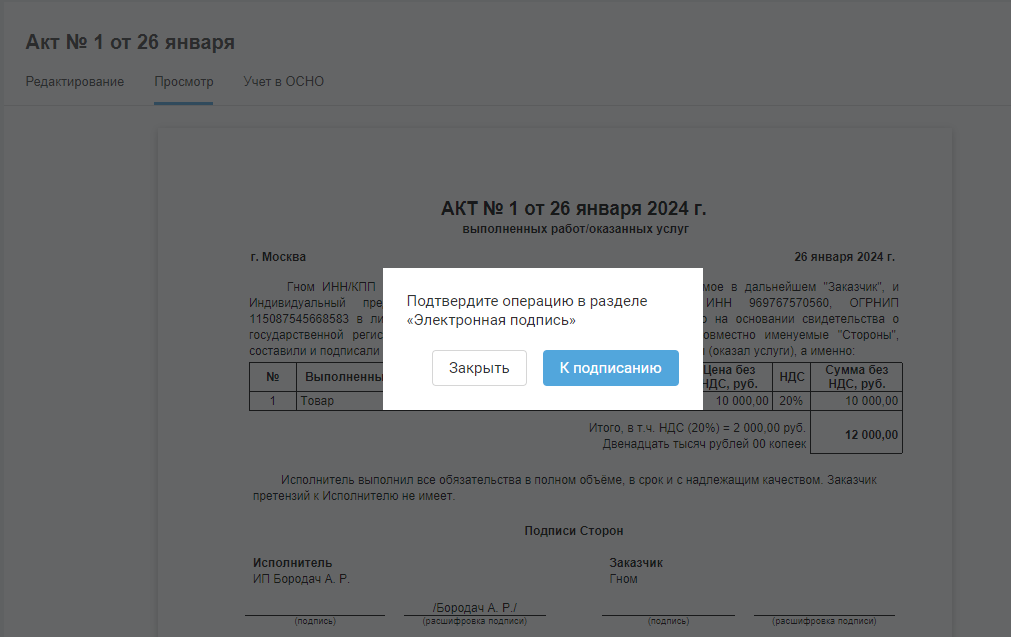 Далее вам необходимо подтвердить отправку. На настроенном рабочем месте необходимо подписать отправляемый документ в разделе «Электронная подпись»: