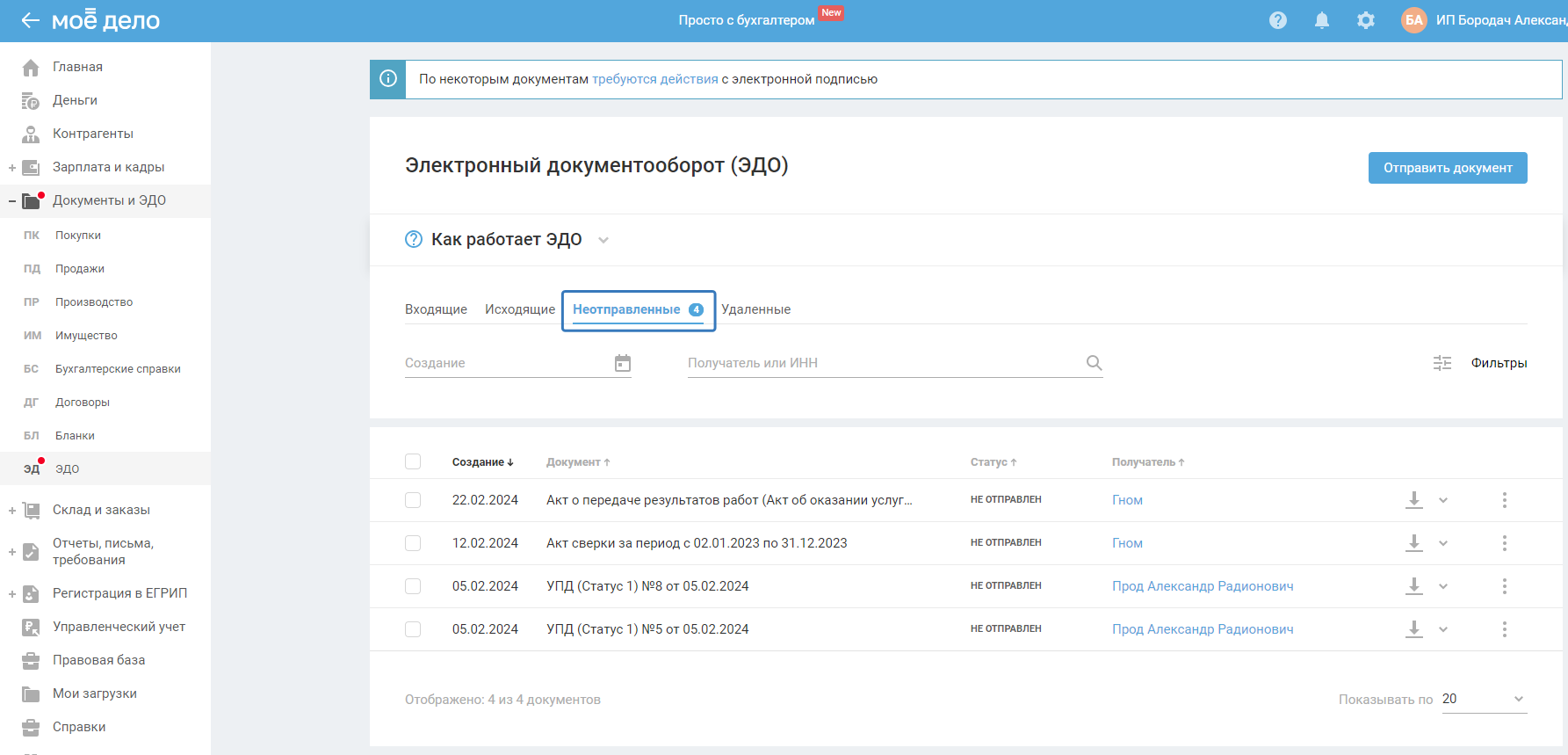 До момента подписания документ будет находится во вкладке «Неотправленные»: