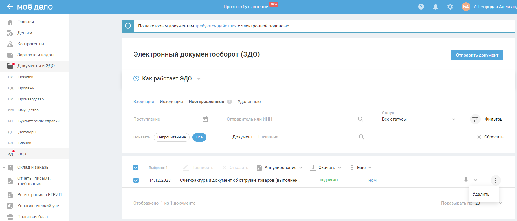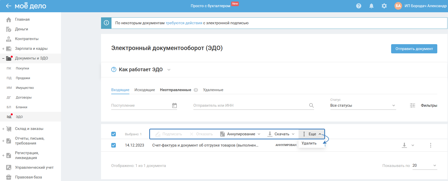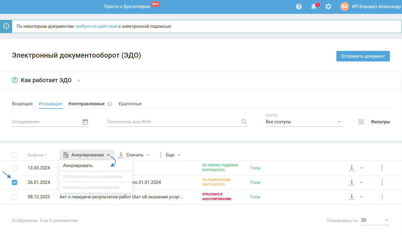 Если вам нужно аннулировать документ, выделите документ галочкой и выберите «Аннулирование» — «Аннулировать»: