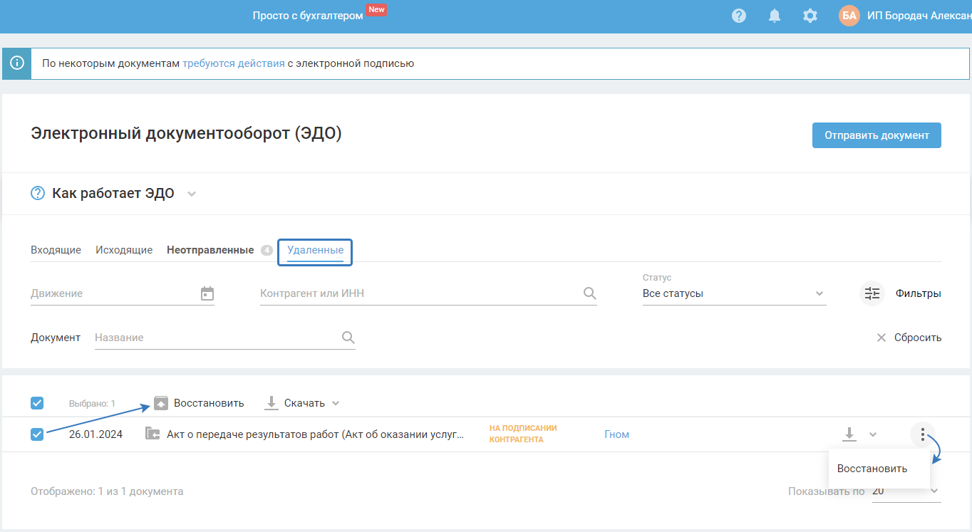 6. Если после удаления документа требуется его восстановление, перейдите во вкладку «Удалённые», нажмите либо на вертикальное троеточие напротив документа, либо выделите его галочкой и нажмите «Восстановить»:
