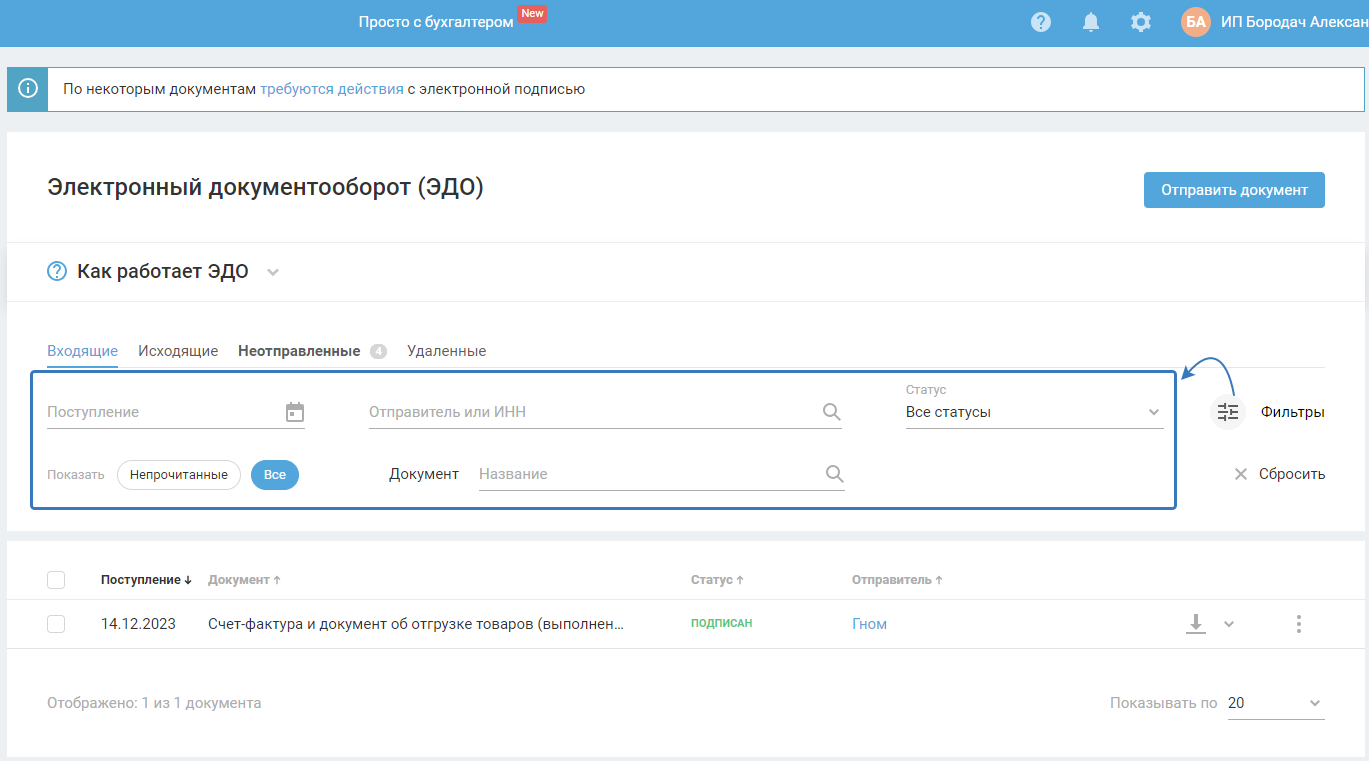 Раздел «ЭДО» можно рассматривать как электронный почтовый ящик для документов. Здесь видны все отправленные вами (вкладка «Исходящие») и полученные от контрагентов (вкладка «Входящие») документы, а также количество непрочитанных входящих документов.