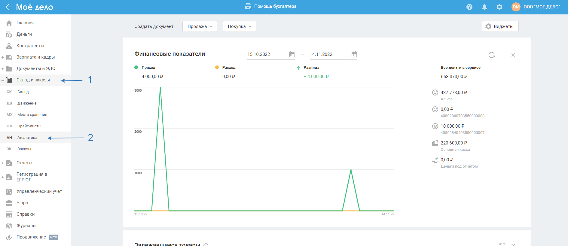 Для перехода в раздел выберите в меню «Склад и заказы — Аналитика»: