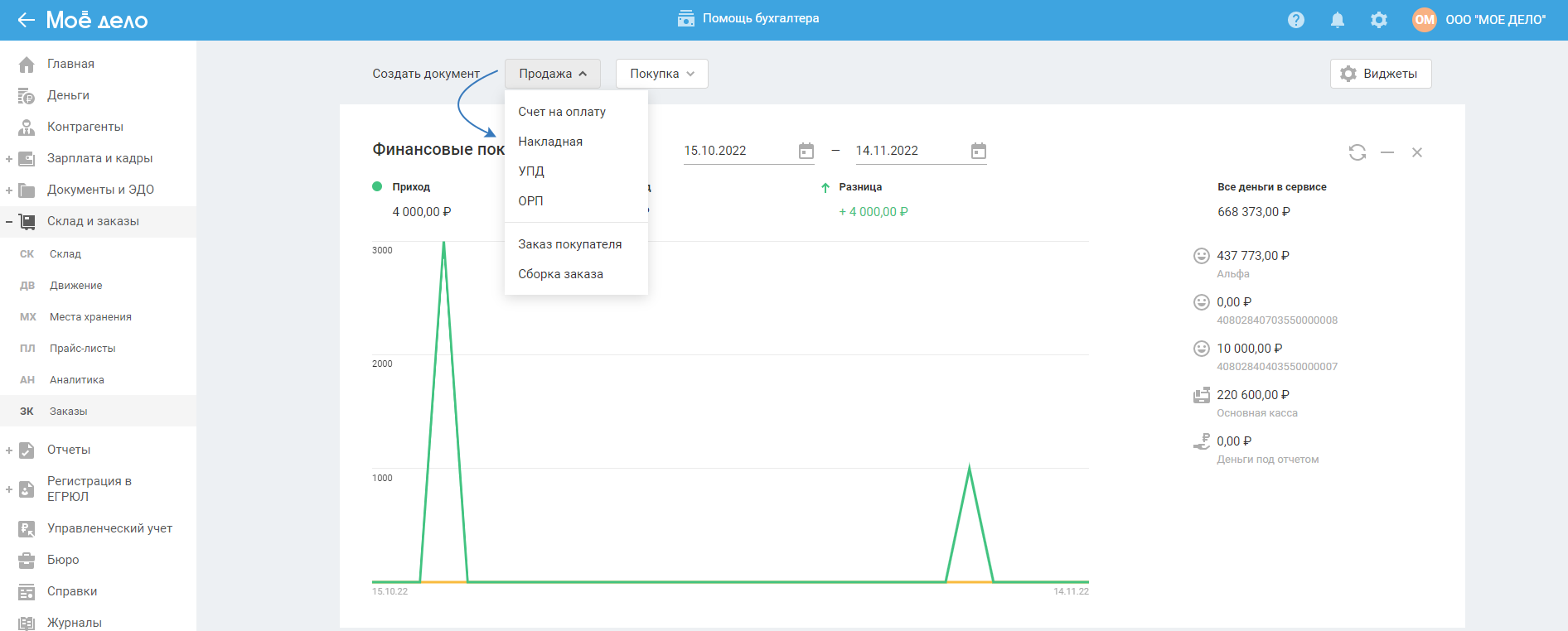 - «Счёт на оплату» — открывается окно для создания счета на оплату;
