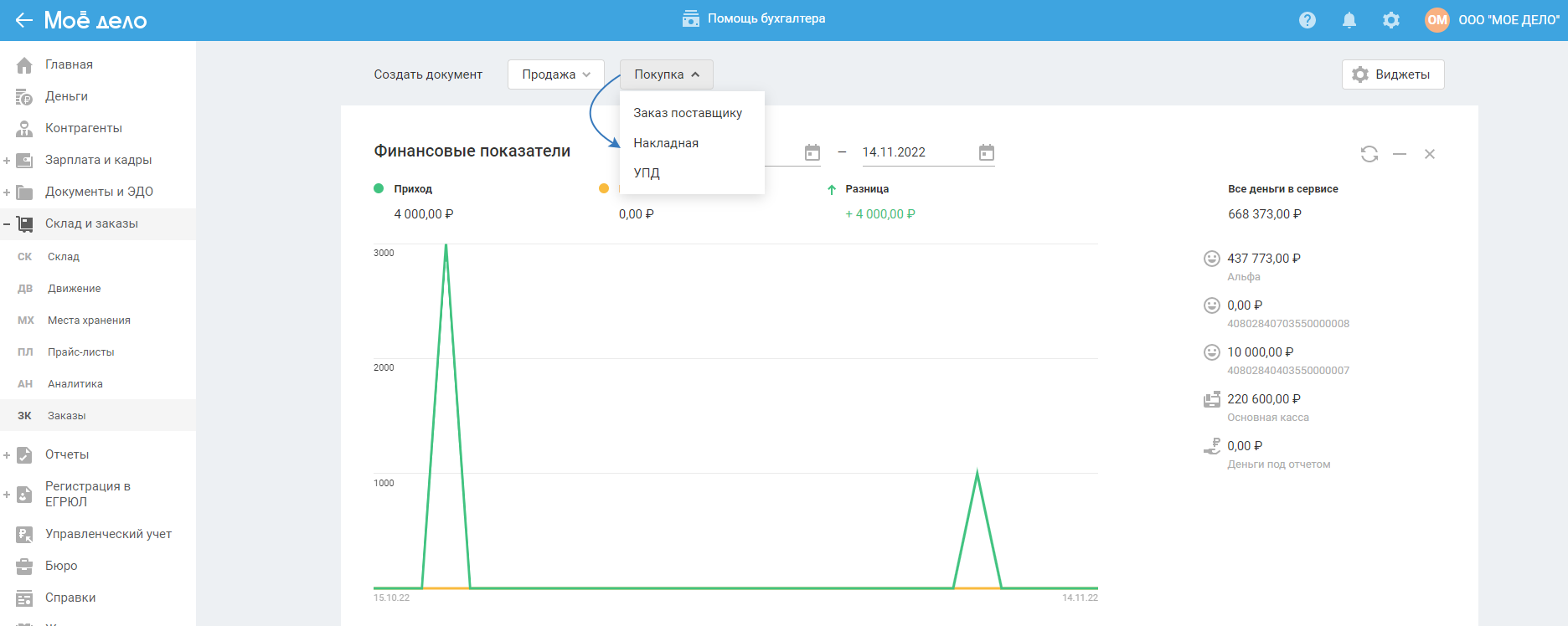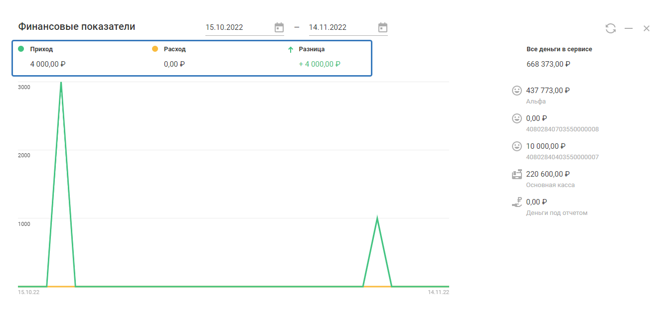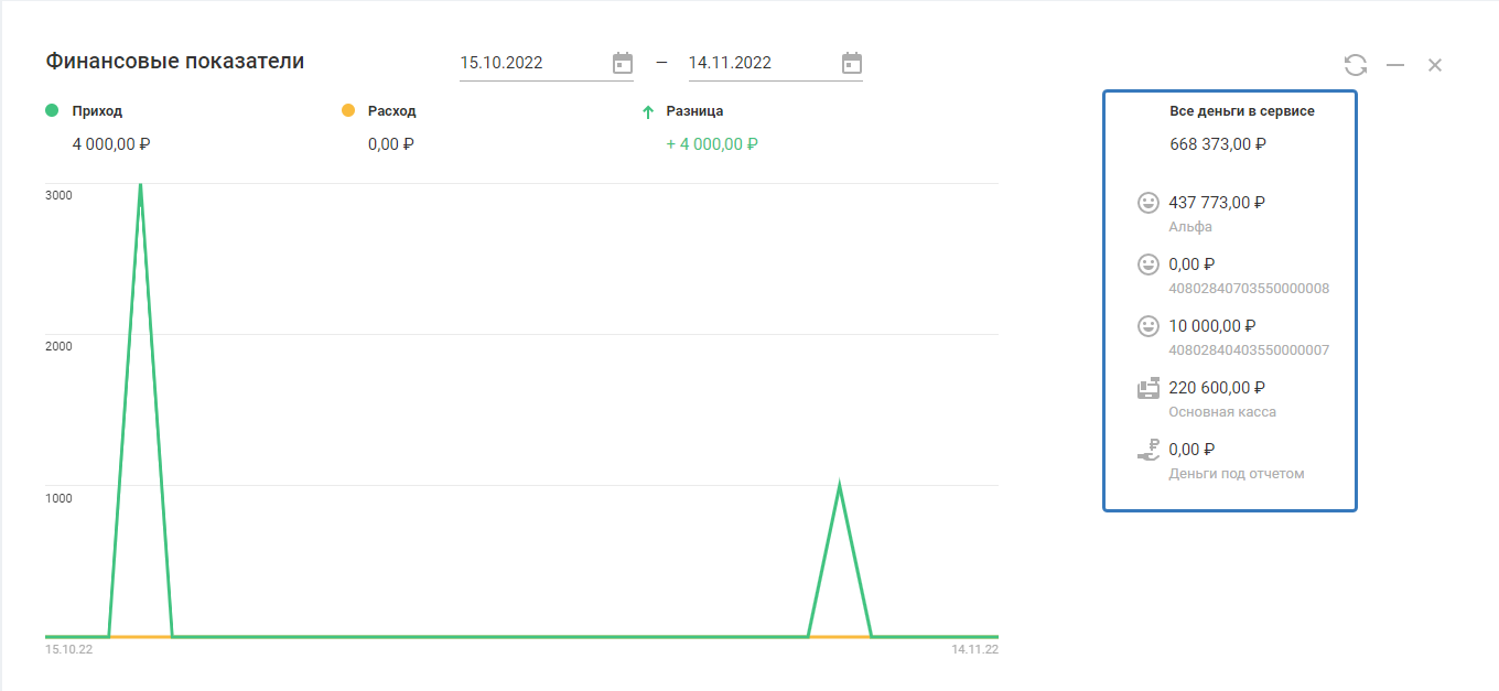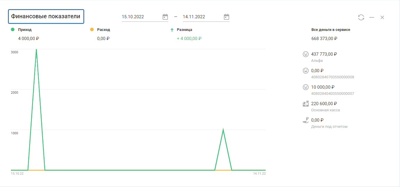 Виджет «Финансовые показатели» помогает оценивать денежное состояние предприятия, отслеживая расходы и доходы по дням. Вследствие чего вы можете избежать кассовых разрывов, контролировать траты и увеличивать свою прибыль.