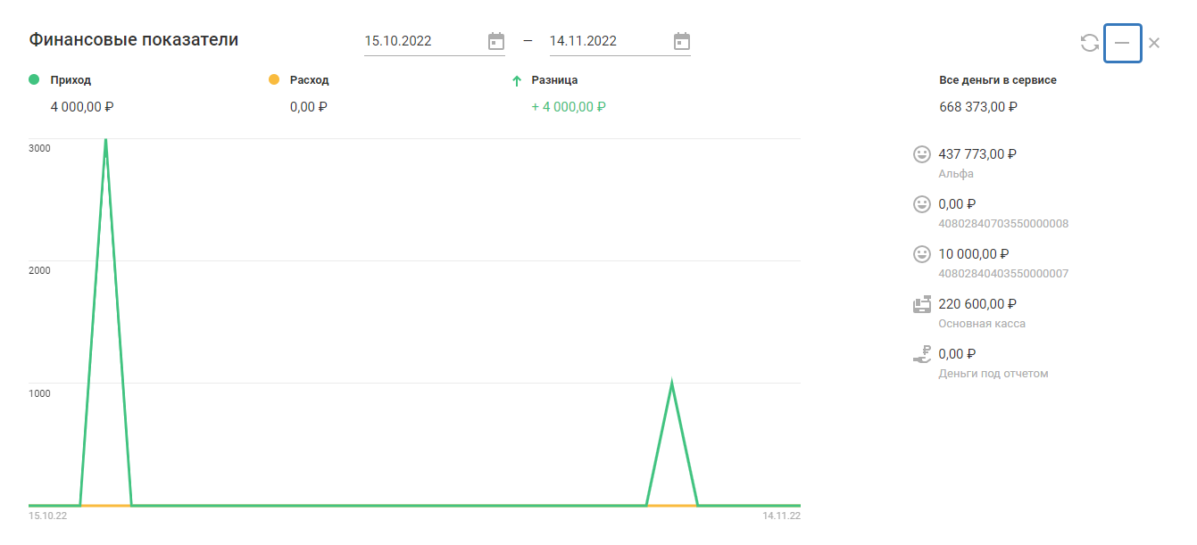 Виджет имеет сворачиваемый вид (без графика), т.е. отображение только суммарных данных по приходу, расходу денежных средств. Для этого нажмите в правом верхнем углу данного виджета «Свернуть»:
