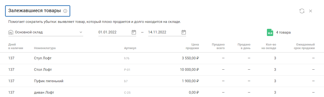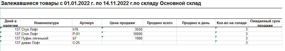 Отчёт по залежавшимся товарам имеет следующий вид: