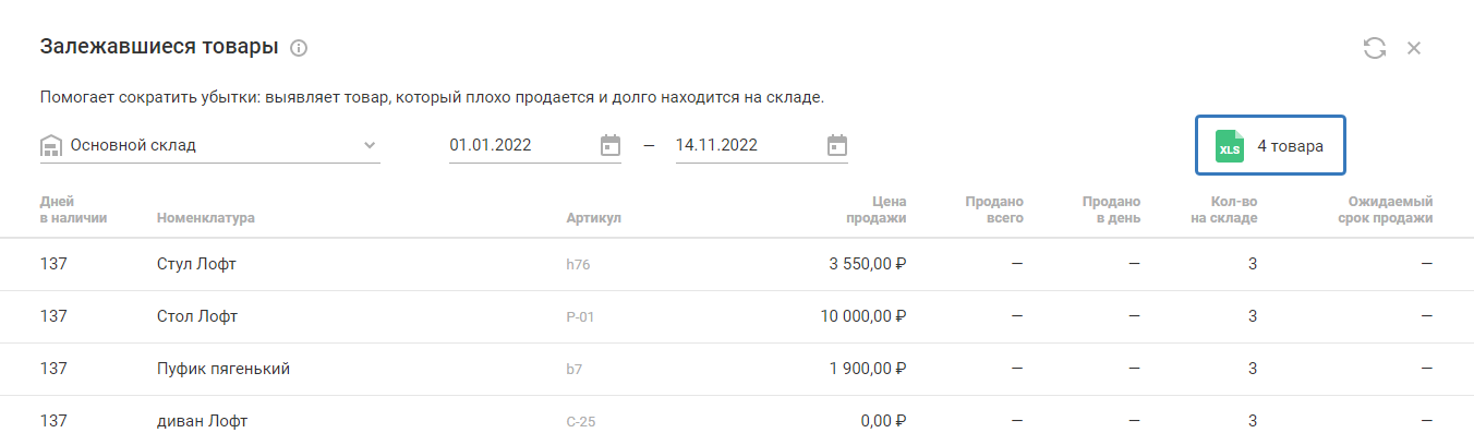 В виджете вы можете скачать отчёт по залежавшимся товарам: