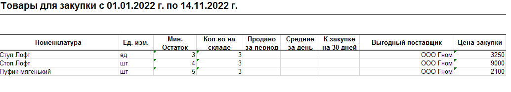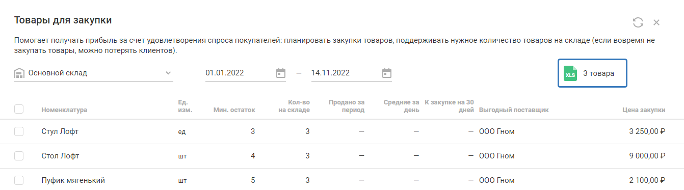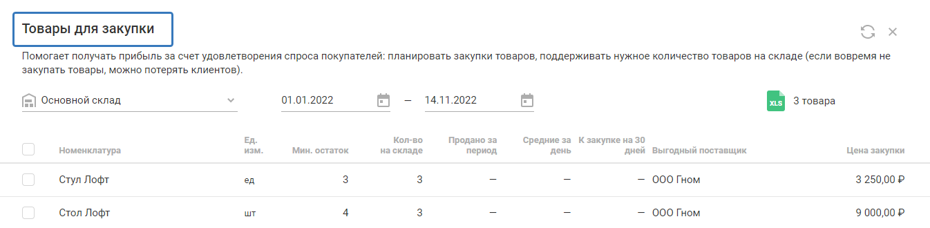 В виджете вы можете скачать отчёт по товарам для закупки: