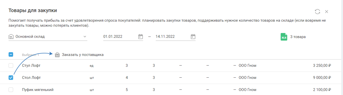 Выбирая галкой необходимые товары для заказа, появляется возможность эти товары «Заказать у поставщика»: