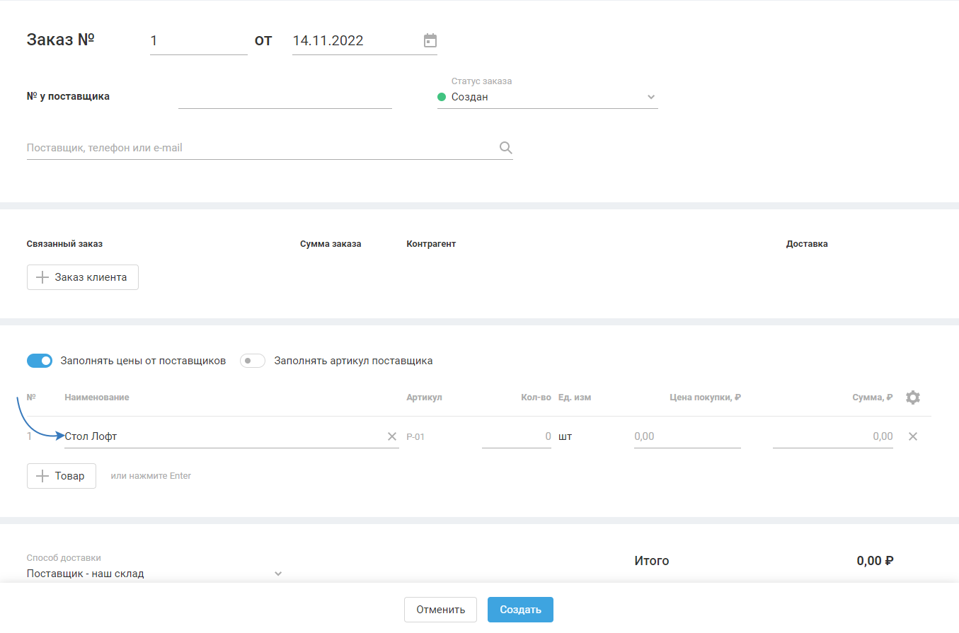 Далее открывается окно «Заказ» поставщику, в котором уже будет указан товар для заказа, выбранный ранее в виджете «Товары для закупки»:
