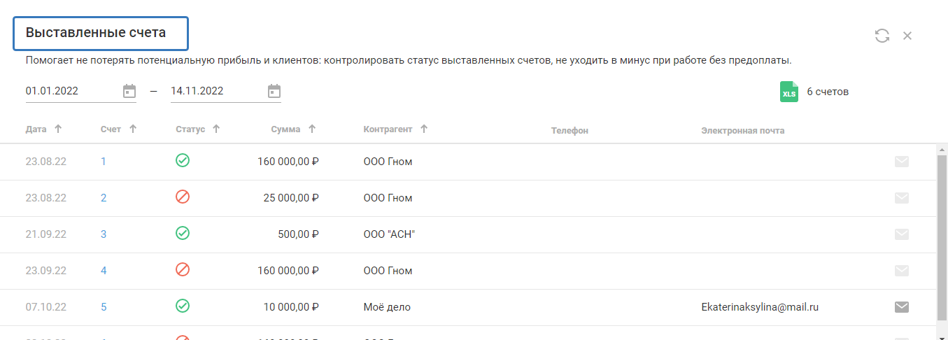 Виджет «Выставленные счета» помогает не потерять потенциальную прибыль и клиентов: контролировать статус выставленных счетов, не уходить в минус при работе без предоплаты.