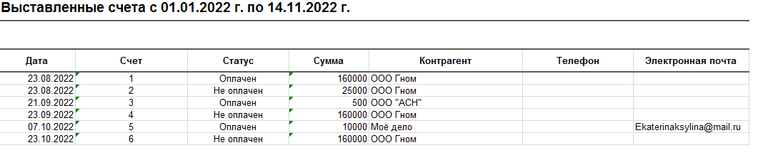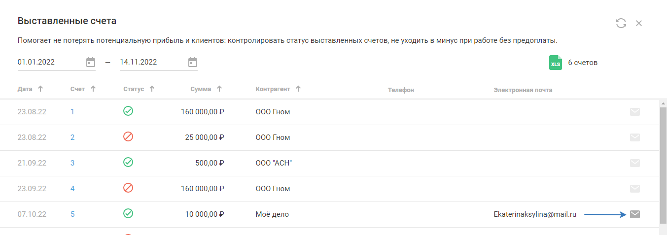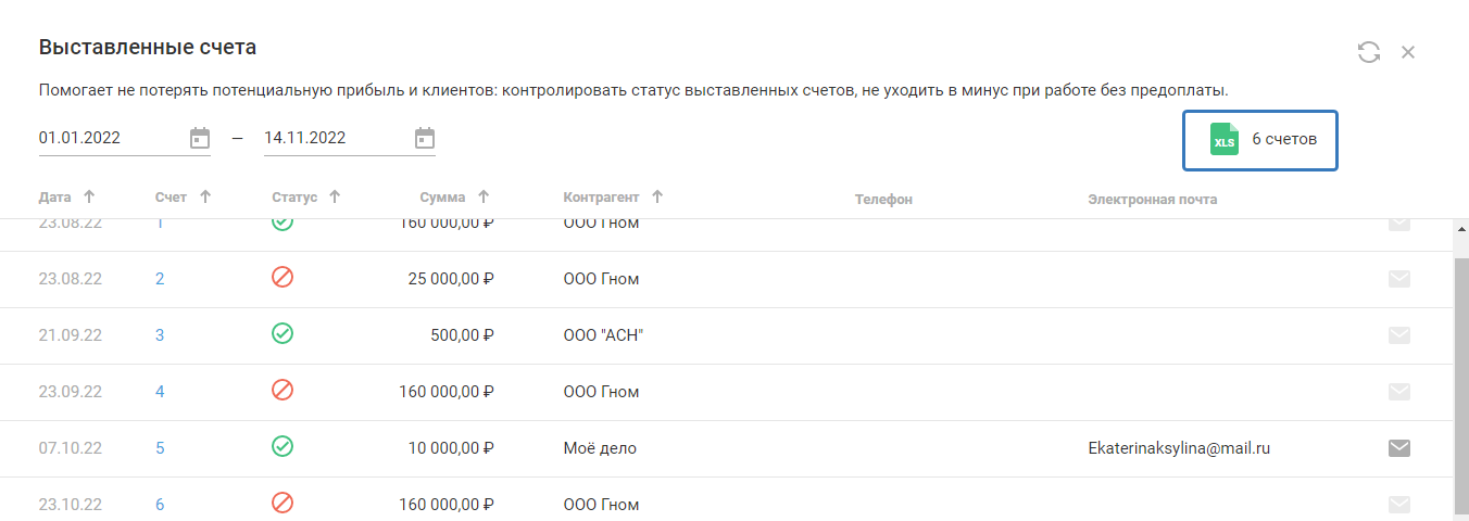 В виджете вы можете скачать отчёт по выставленным счетам:
