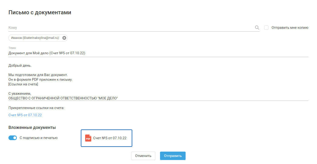Далее открывается окно «Письмо с документами» с вложенным счётом: