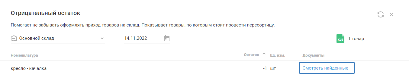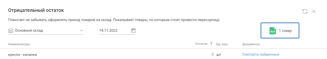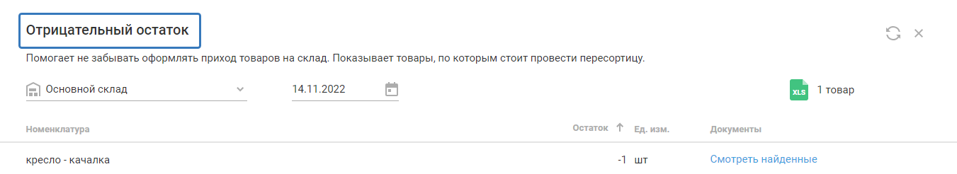 В виджете вы можете скачать отчёт по товарам с отрицательными остатками: