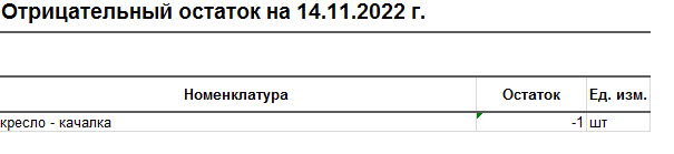 Отчёт по товарам с отрицательными остатками имеет следующий вид: