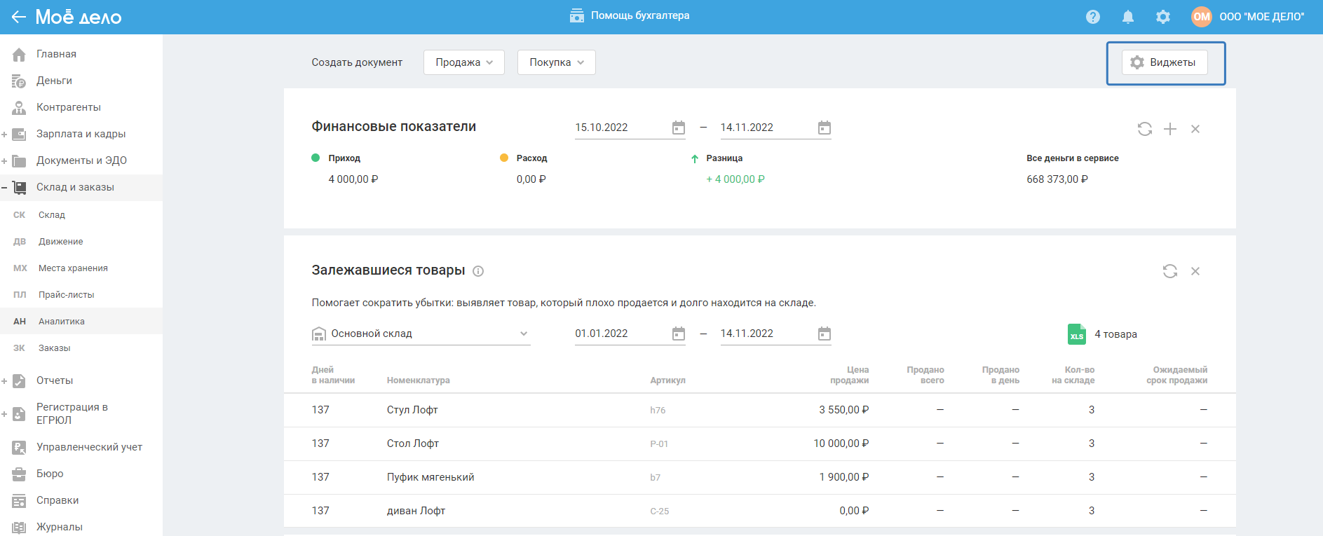 Виджет «Залежавшиеся товары» помогает выявить товар, который плохо продаётся и долго находится на складе, тем самым позволяет предприятию сократить убытки.