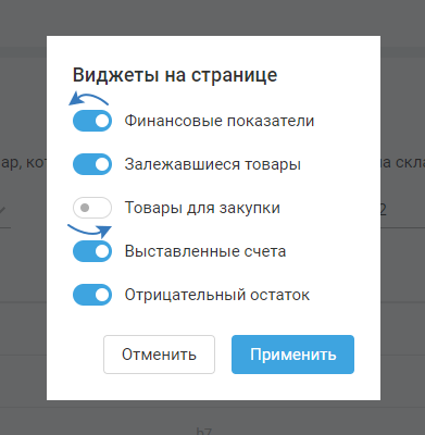 Раздел Аналитика состоит из виджетов: финансовые показатели, залежавшиеся товары, товары для закупки, выставленные счета, отрицательный остаток.