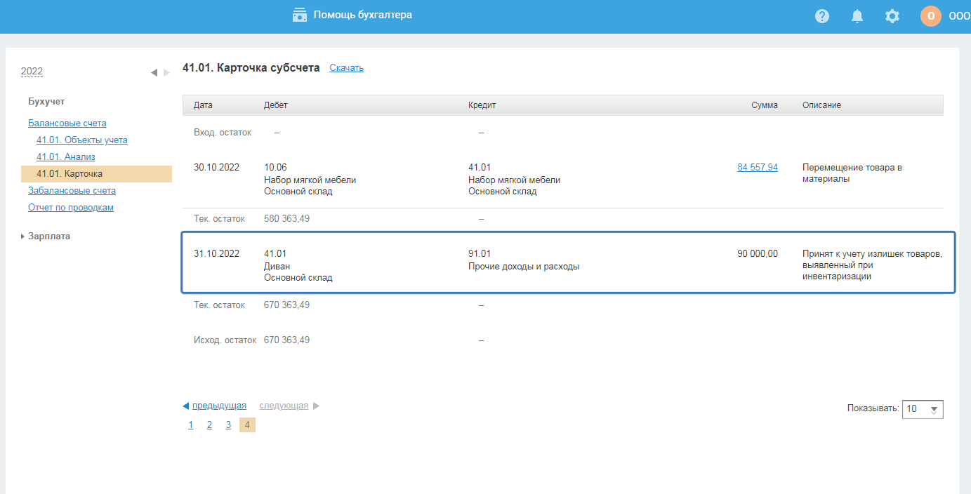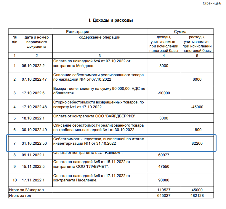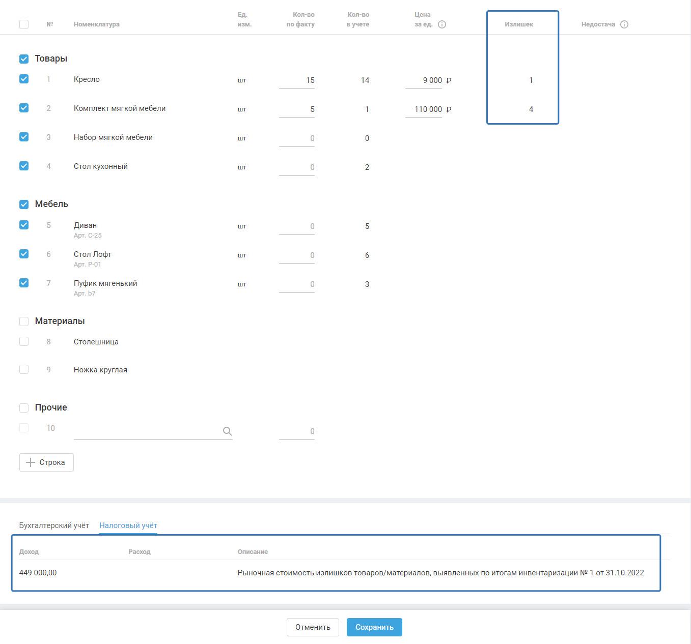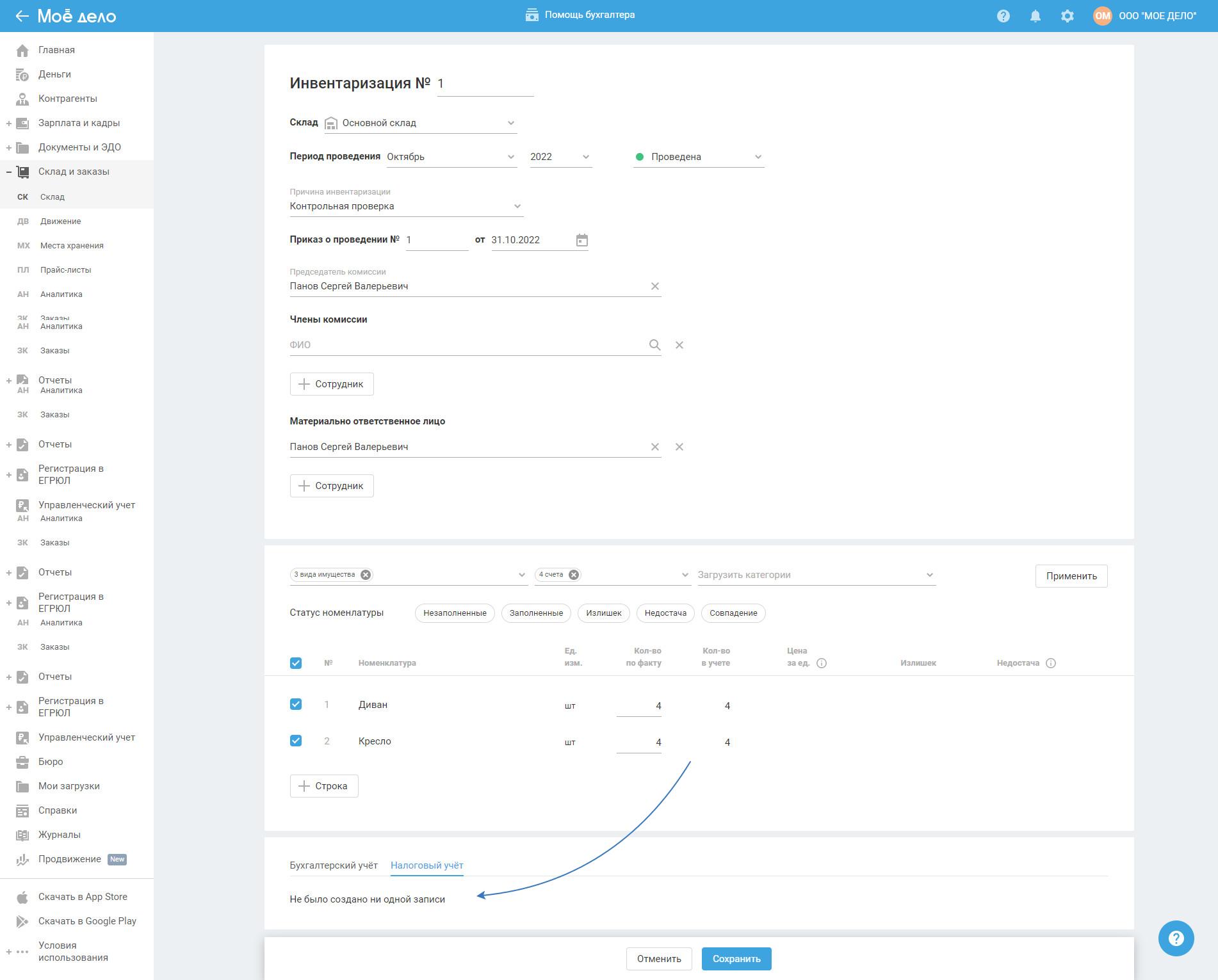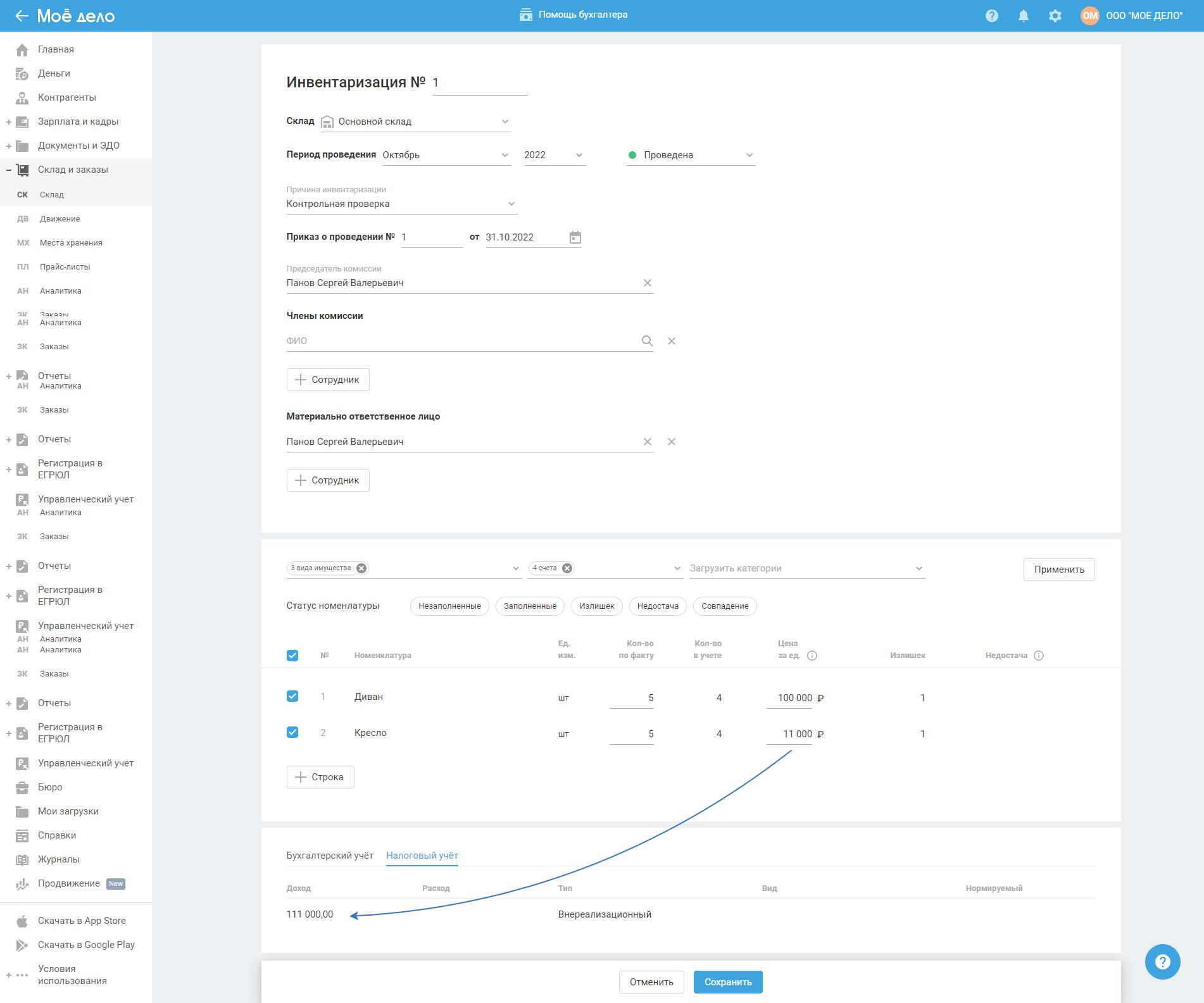 После сохранения инвентаризации будет создан доход в КУДиР.