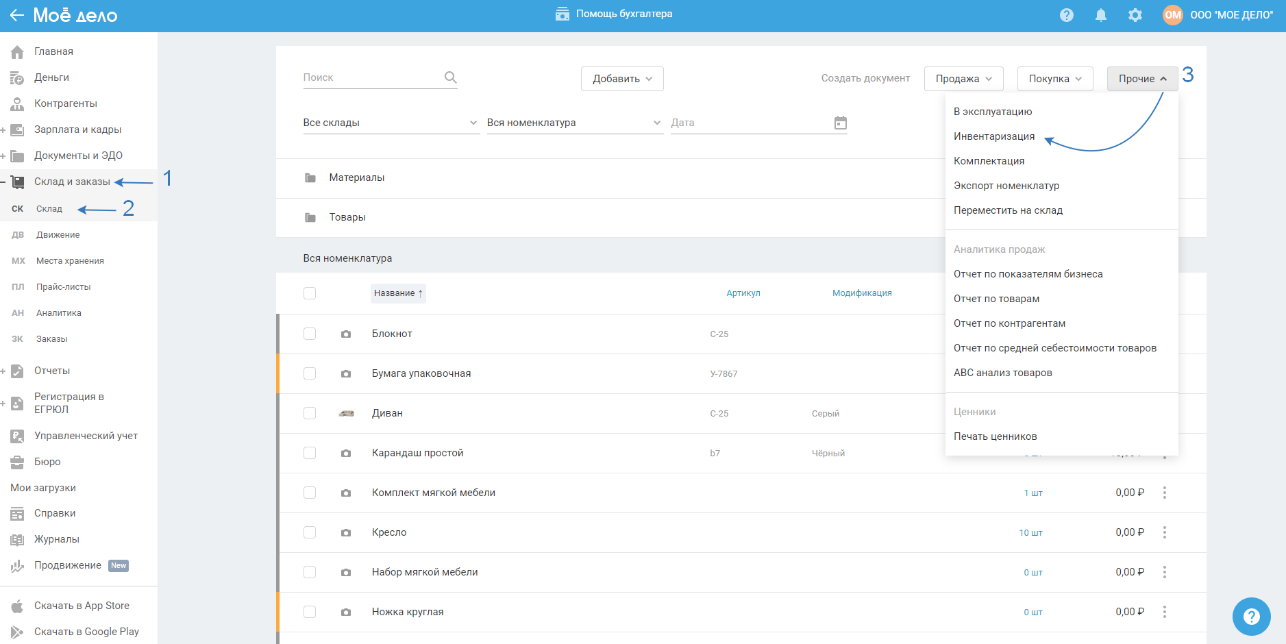 Вариант 1. Перейдите в раздел «Склад и заказы — Склад», нажмите на кнопку «Прочие» и выберите «Инвентаризация»: