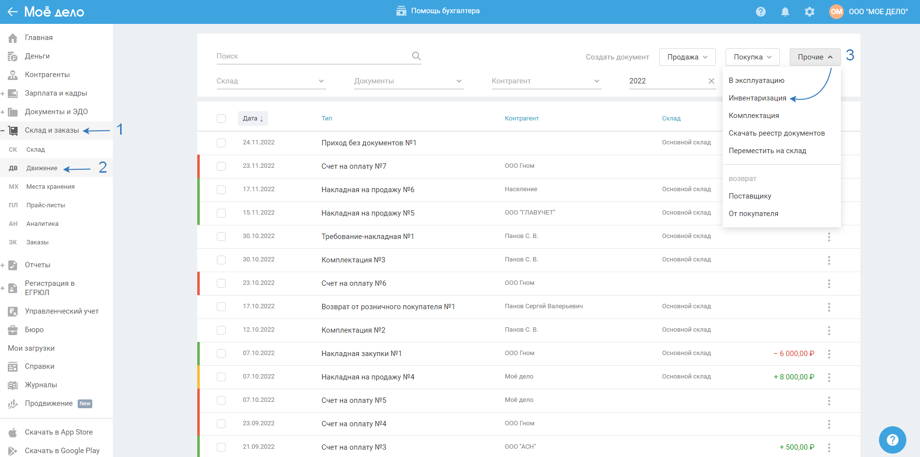 Вариант 2. Перейдите в раздел «Склад и заказы — Движение», нажмите на кнопку «Прочие» и выберите «Инвентаризация»: