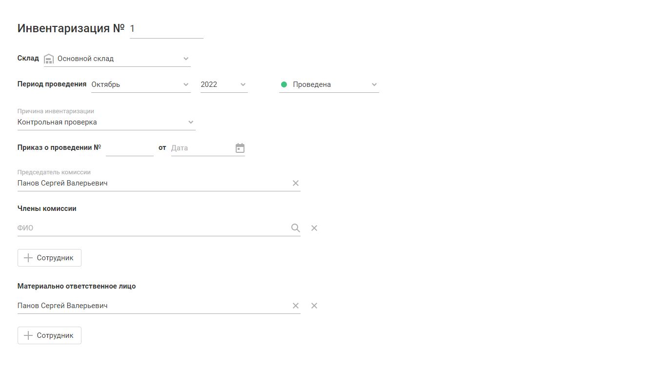 • можно выбрать сотрудника, который числился в штате хотя бы 1 день из периода проведения инвентаризации.