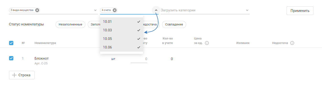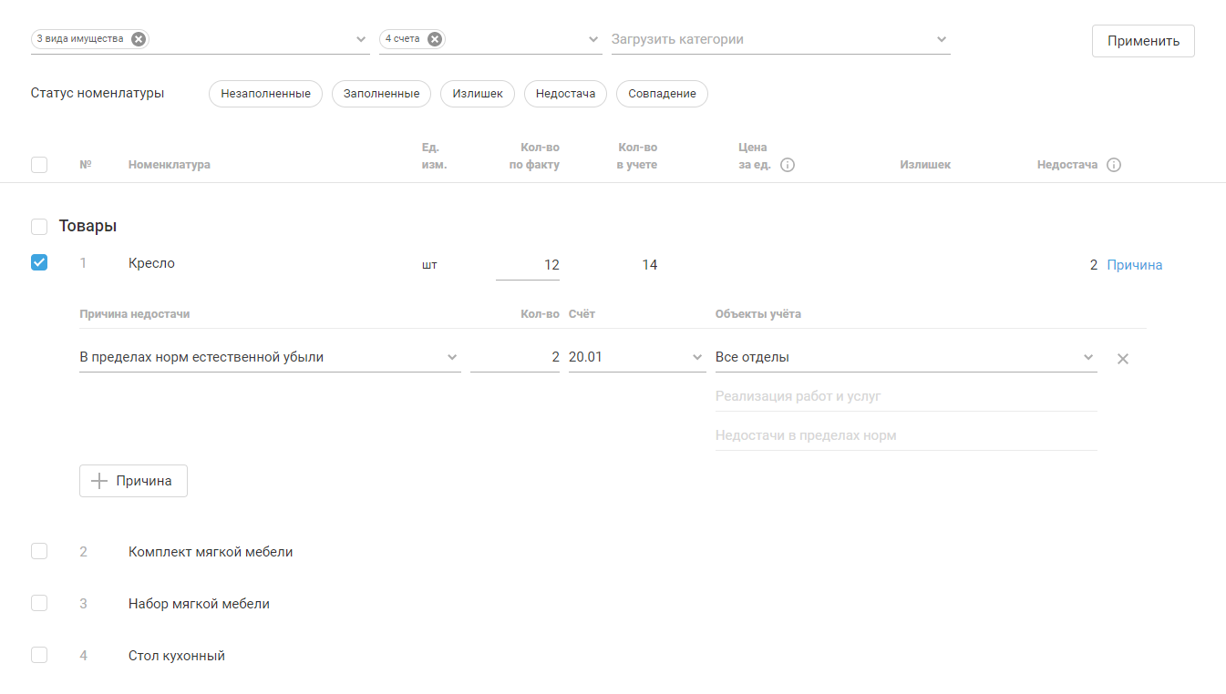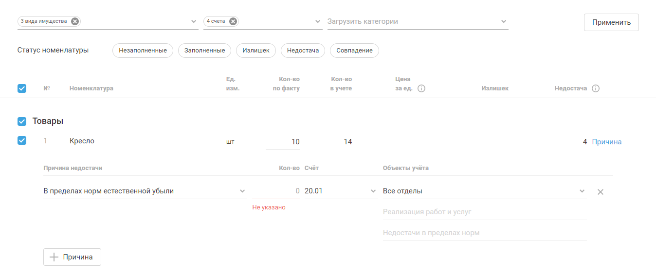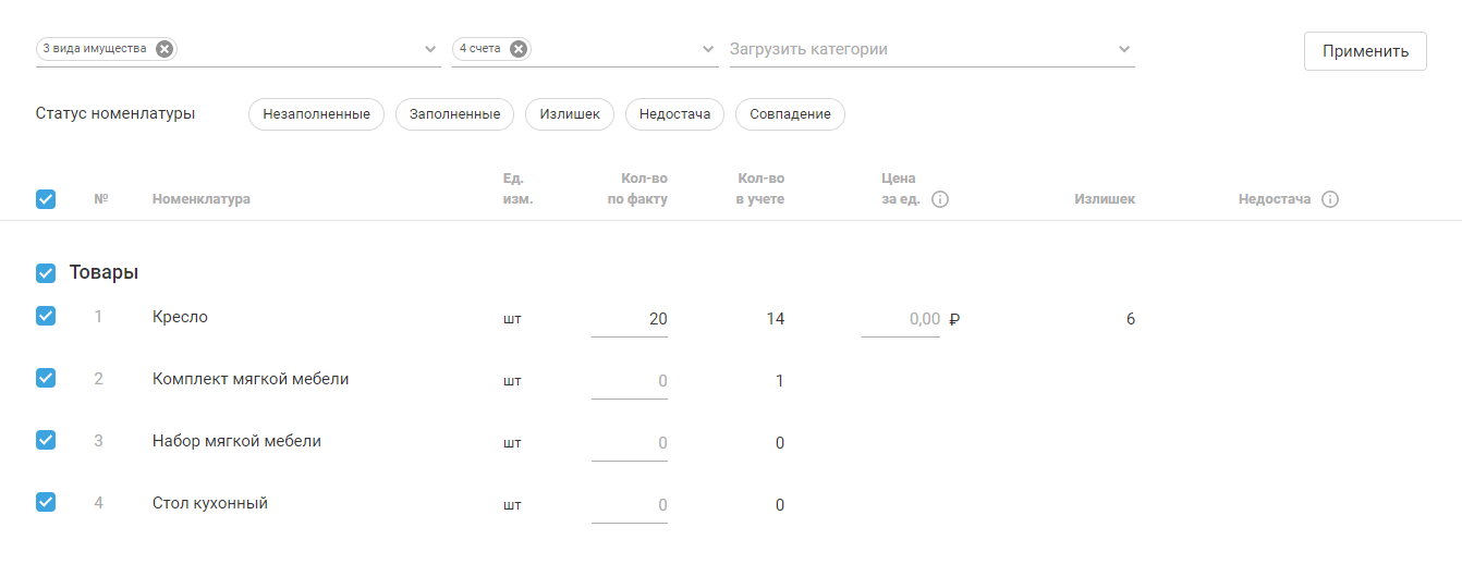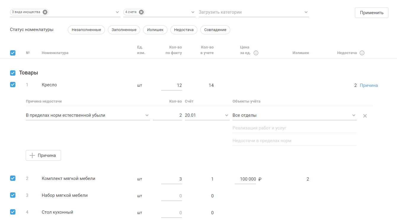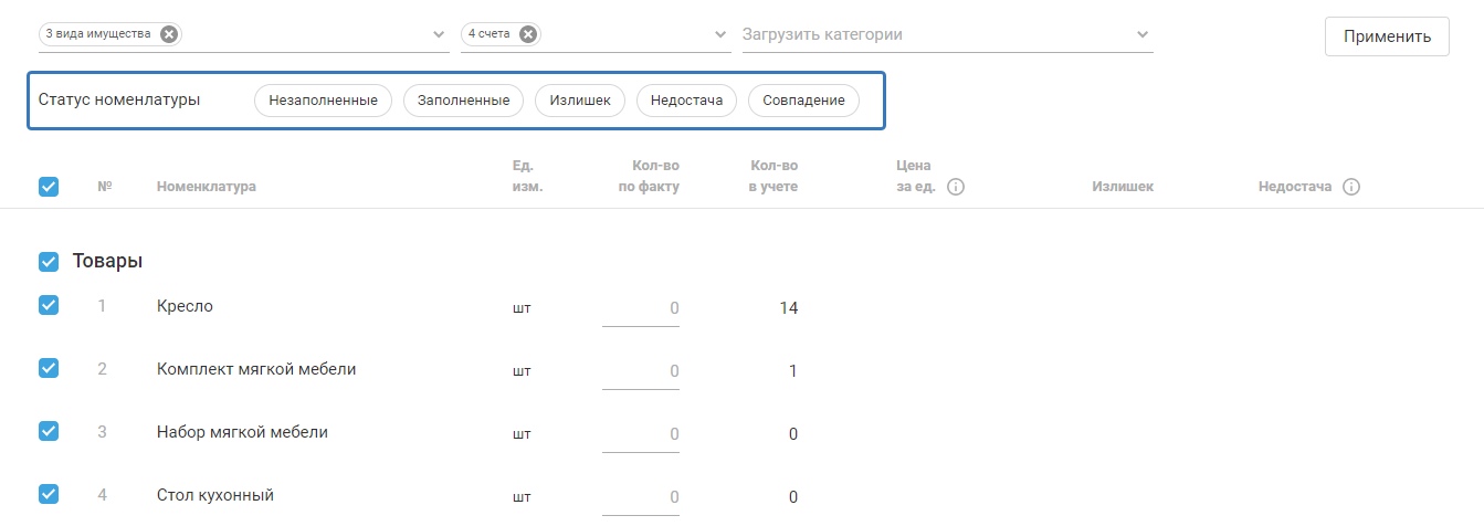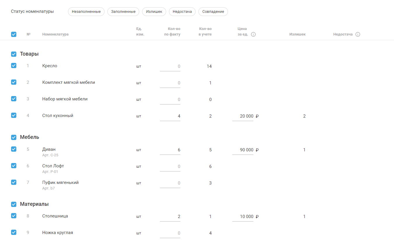 После того как будут заполнены данные по номенклатуре, вы можете воспользоваться фильтром по статусам номенклатур, выбрав что-то одно: незаполненные, заполненные, излишек, недостача, совпадение: