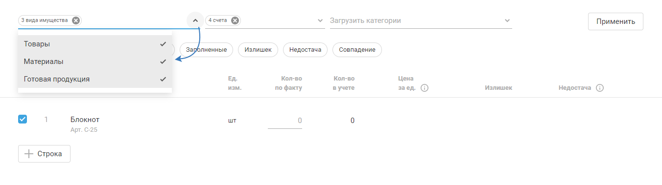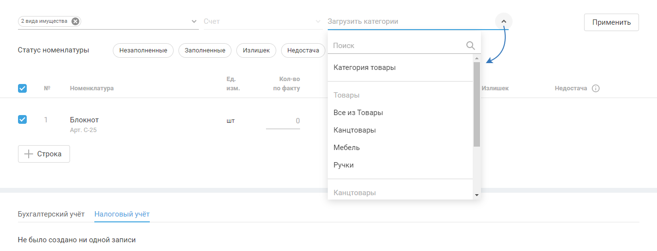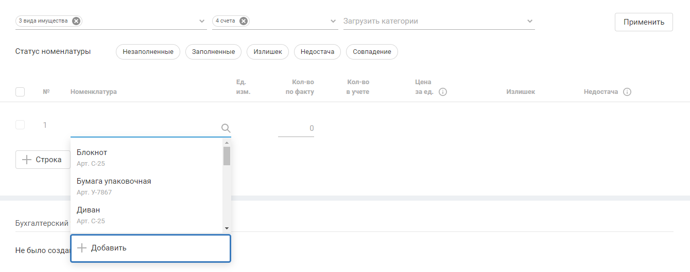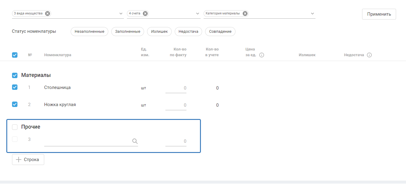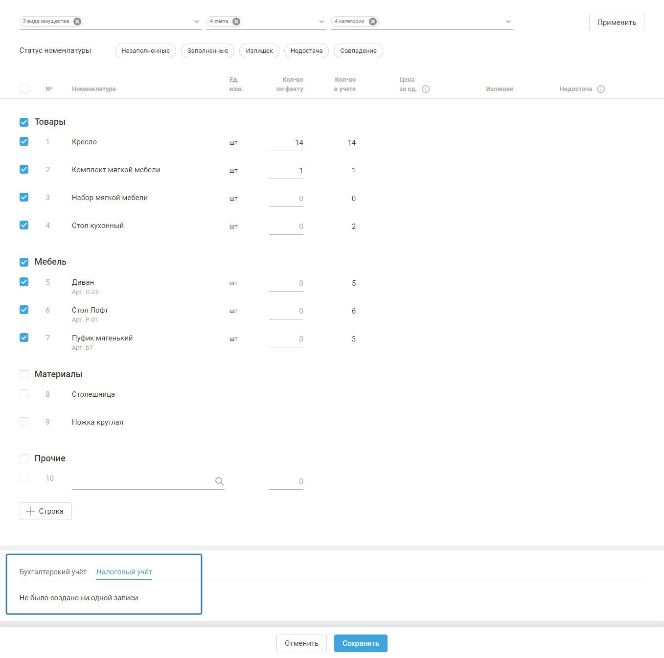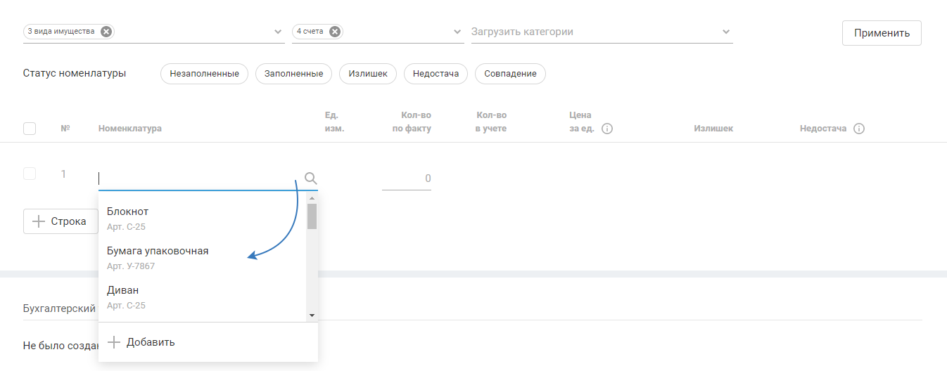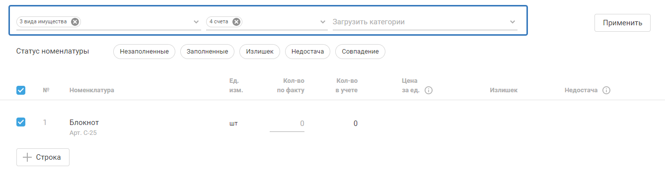 После того как будут заполнены данные по номенклатуре, вы можете воспользоваться фильтром по статусам номенклатур, выбрав что-то одно: незаполненные, заполненные, излишек, недостача, совпадение: