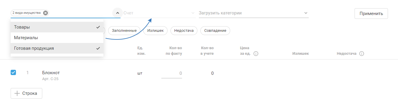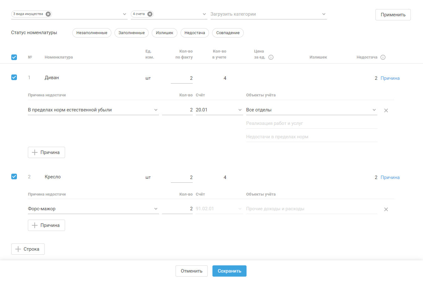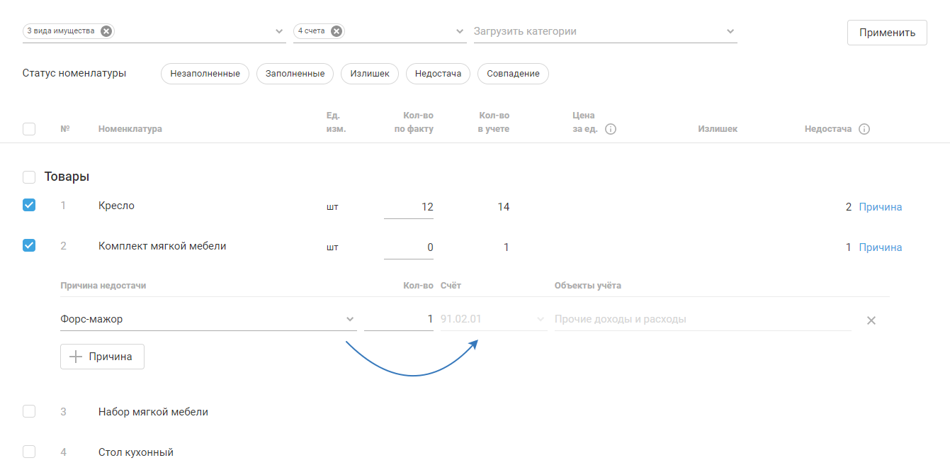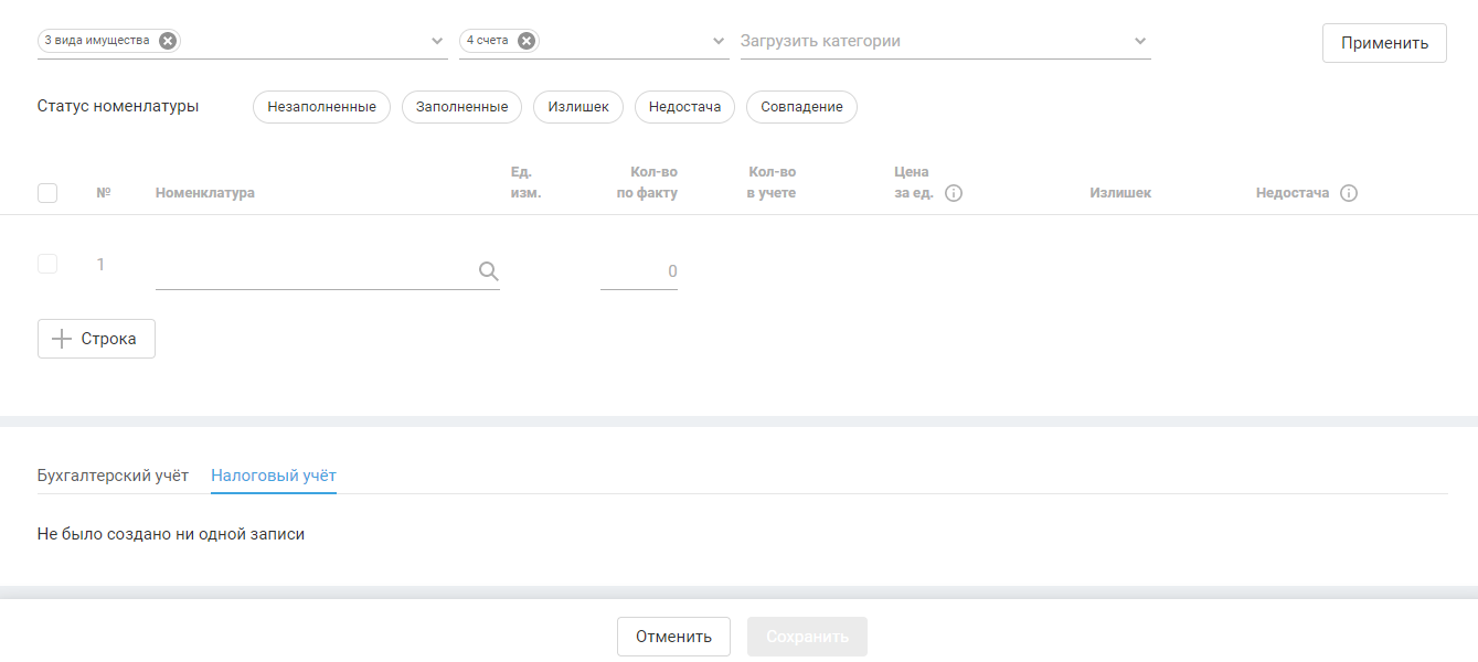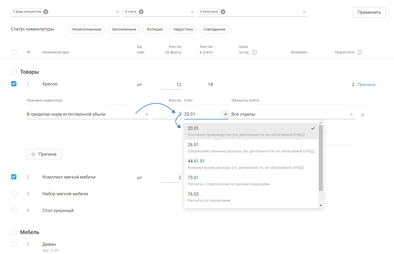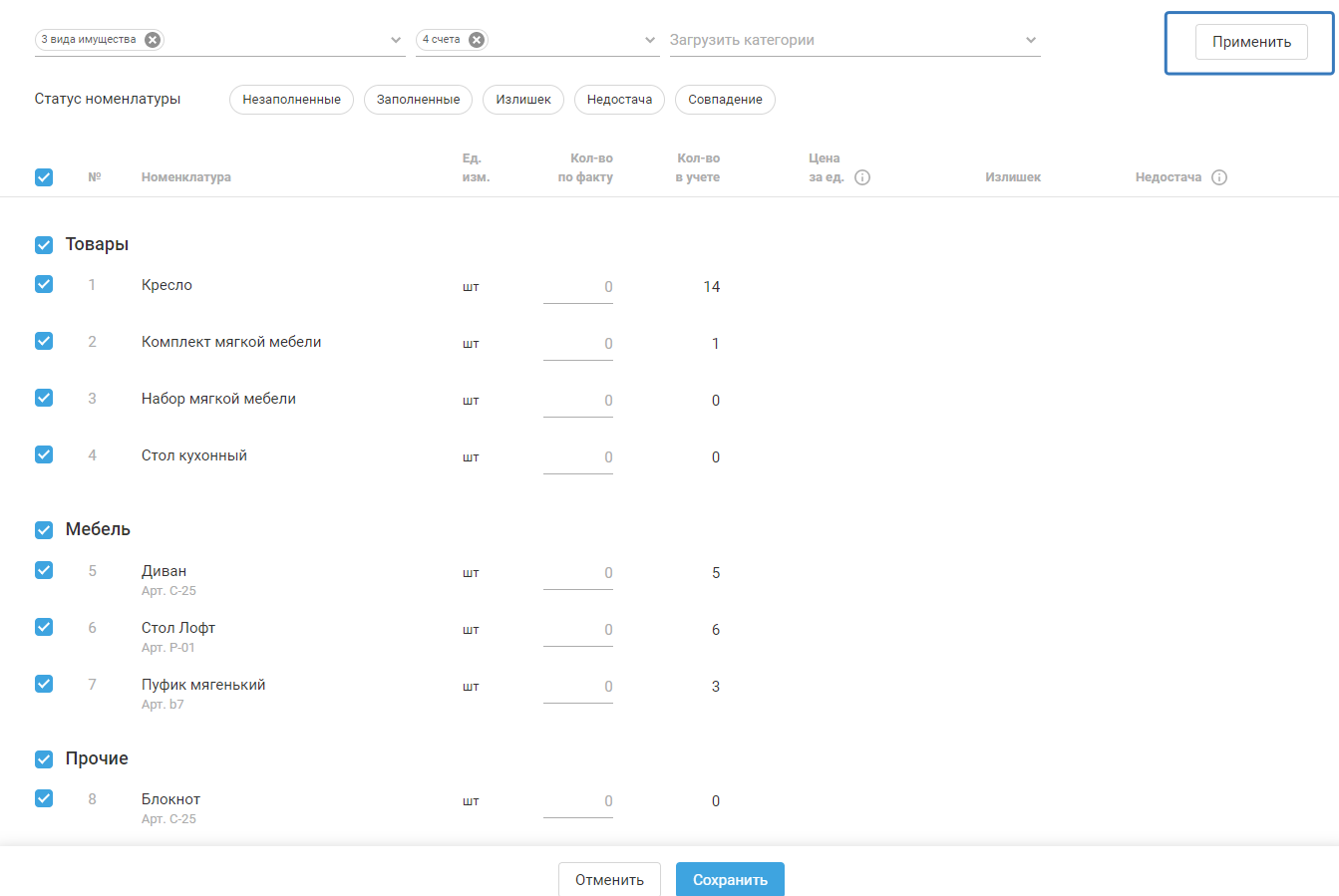 После того как будут заполнены данные по номенклатуре, вы можете воспользоваться фильтром по статусам номенклатур, выбрав что-то одно: незаполненные, заполненные, излишек, недостача, совпадение: