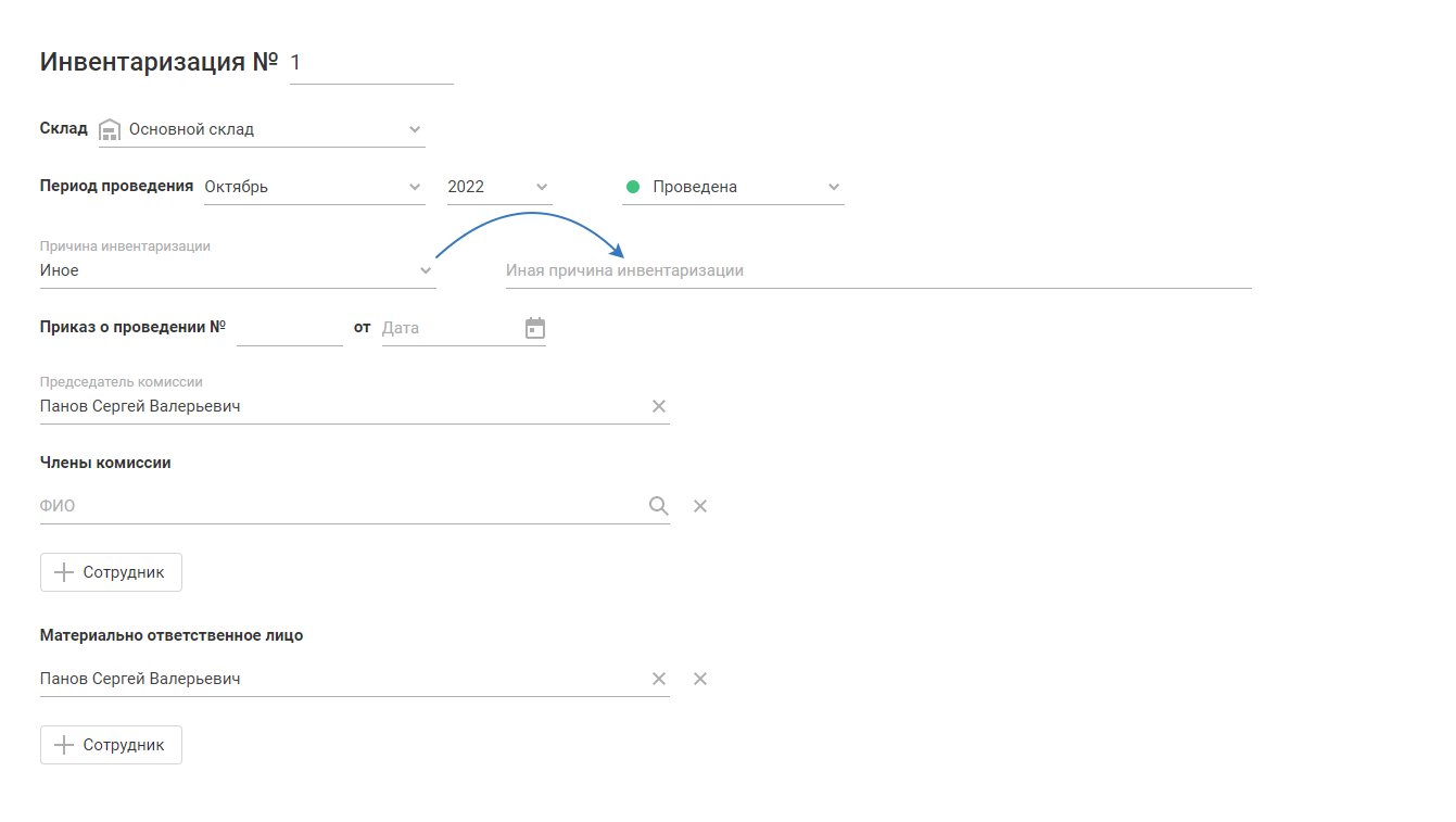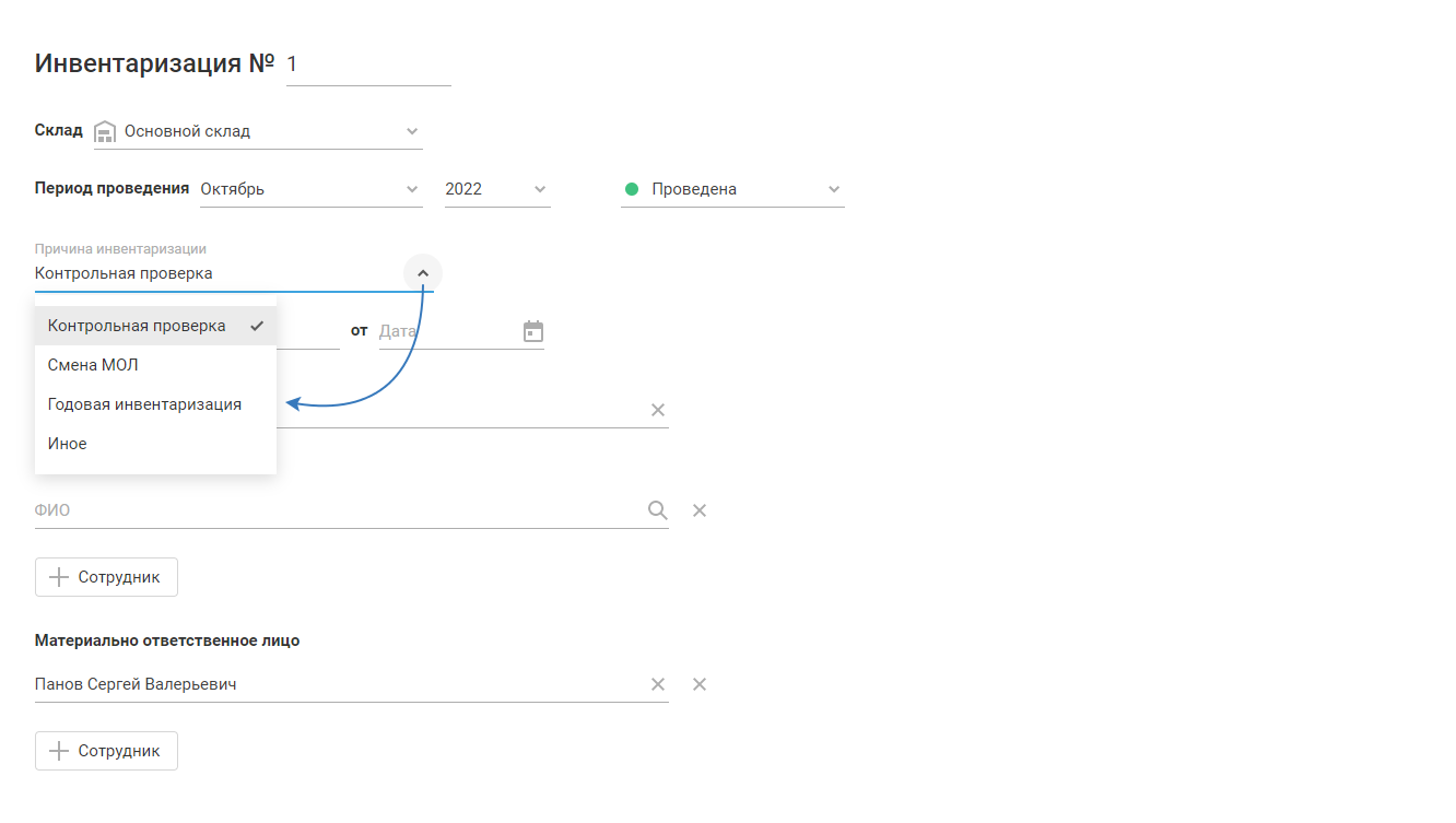 5. Причина инвентаризации. Выберите причину из выпадающего списка: