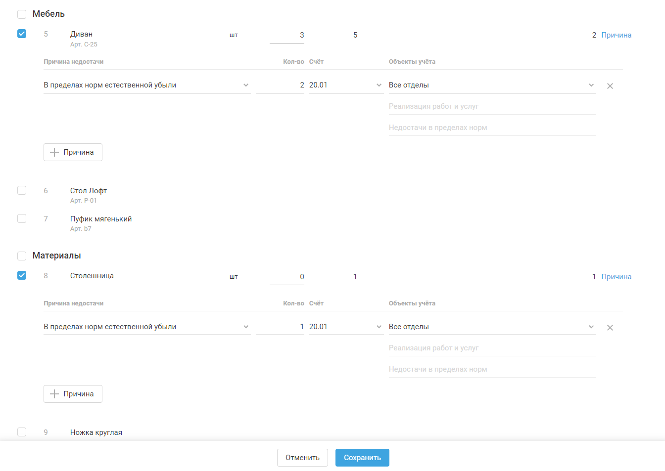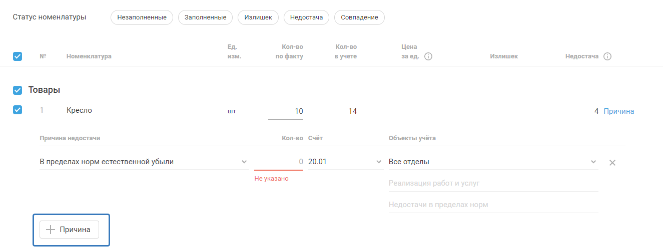 При необходимости можете указать дополнительную причину недостачи с помощью кнопки «+ Причина»: