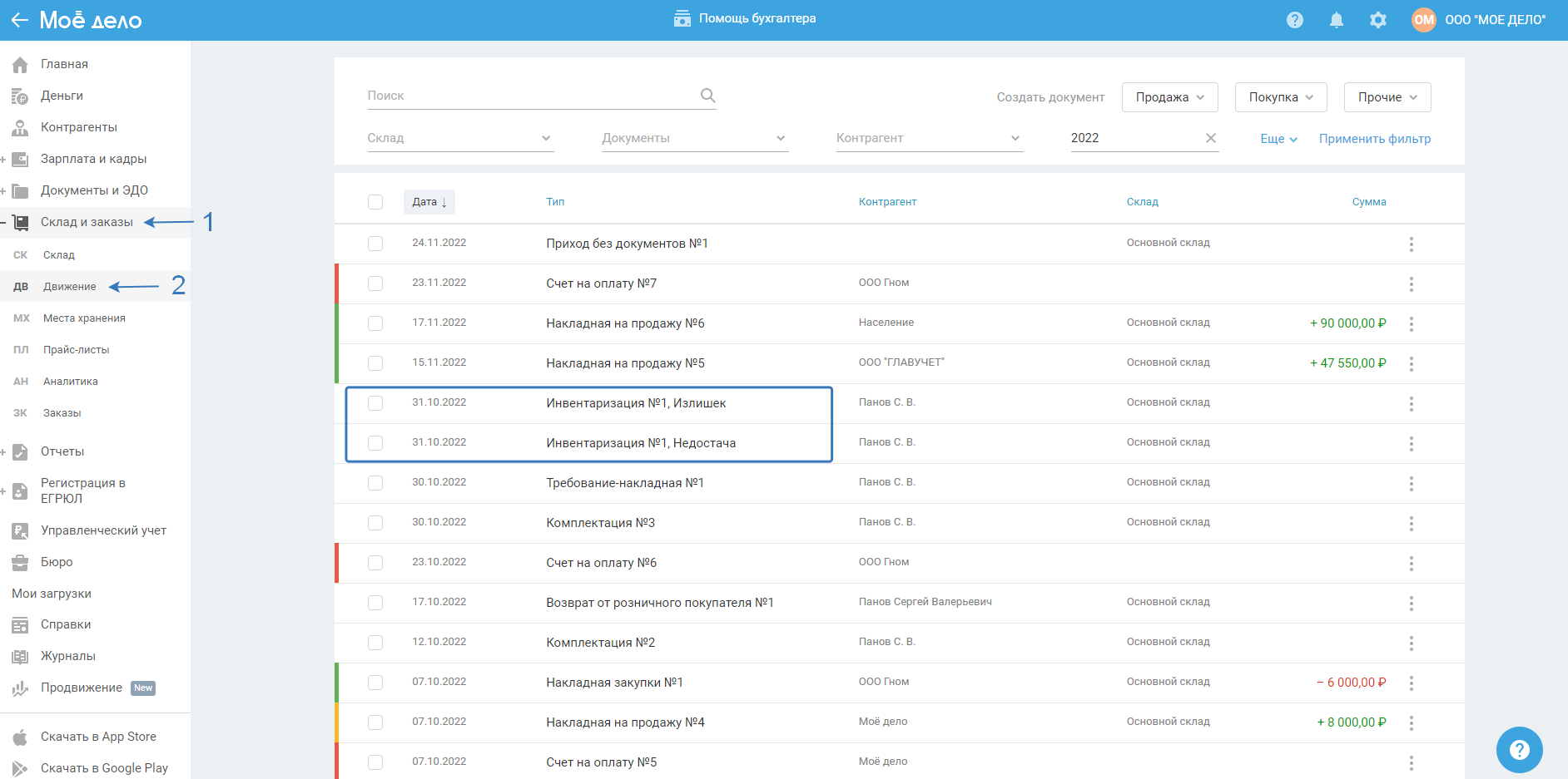 Если в инвентаризации есть излишек или недостача, то в разделе «Движение» вы увидите соответствующие документы:
