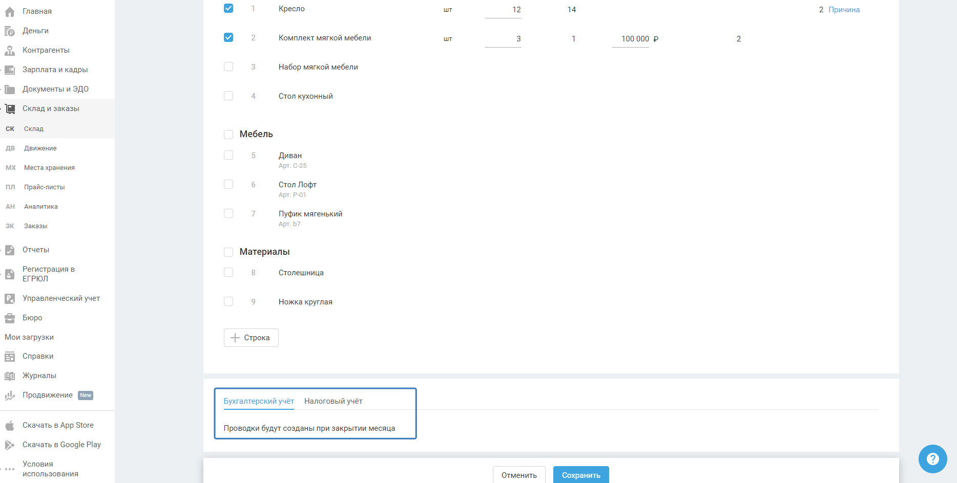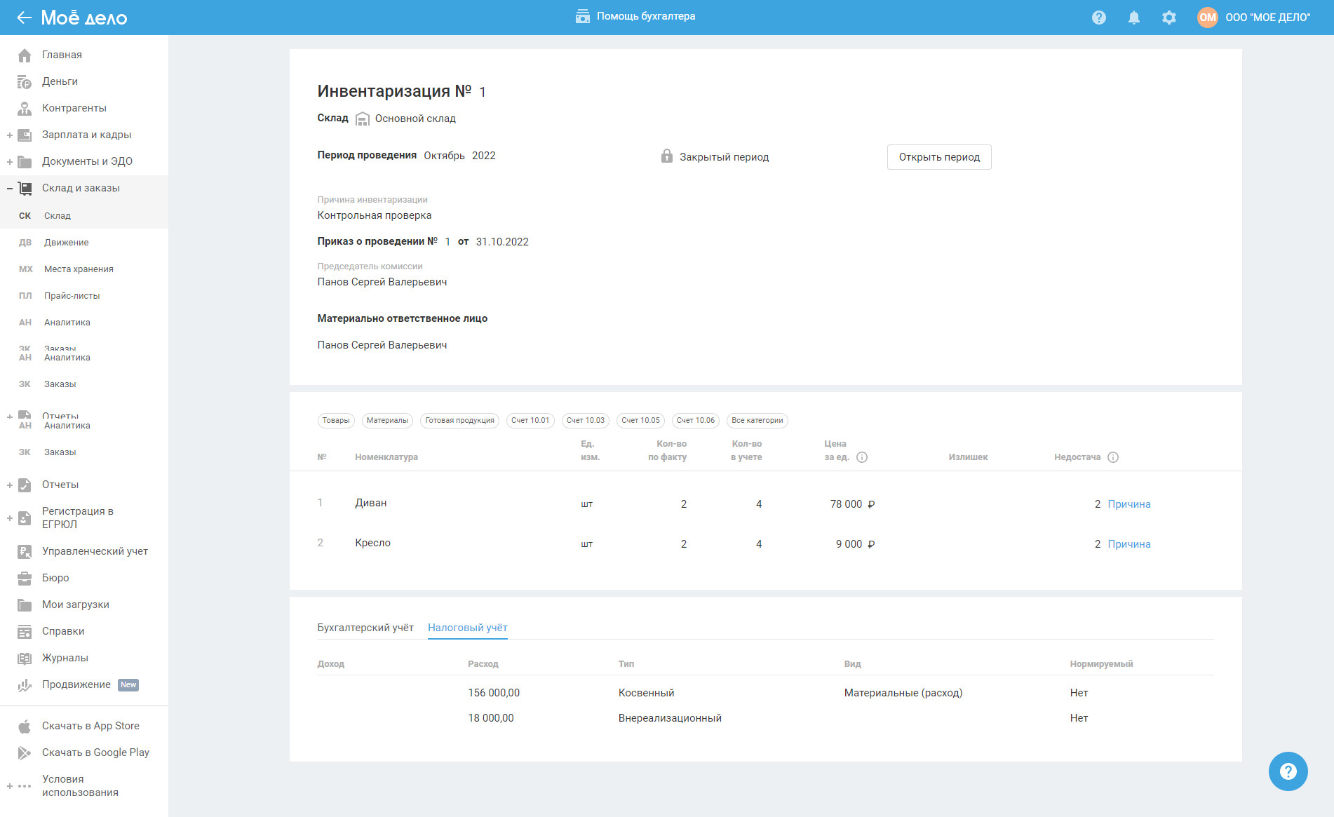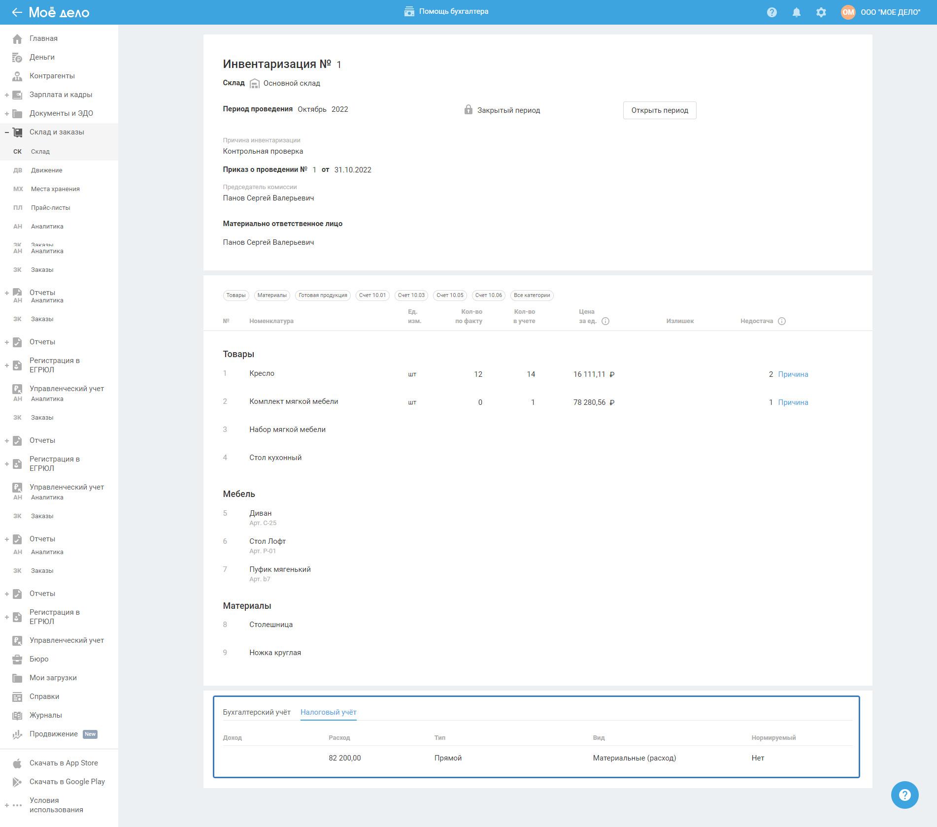 В сервисе реализована инвентаризация товарно-материальных ценностей (ТМЦ).