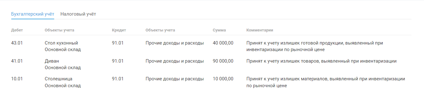 Проводки создаются, если выявлен излишек по номенклатуре, сразу после сохранения инвентаризации и при условии, что статус инвентаризации «Проведена».