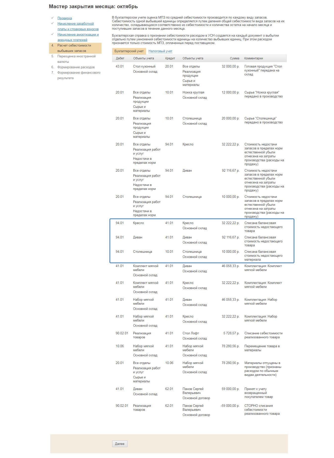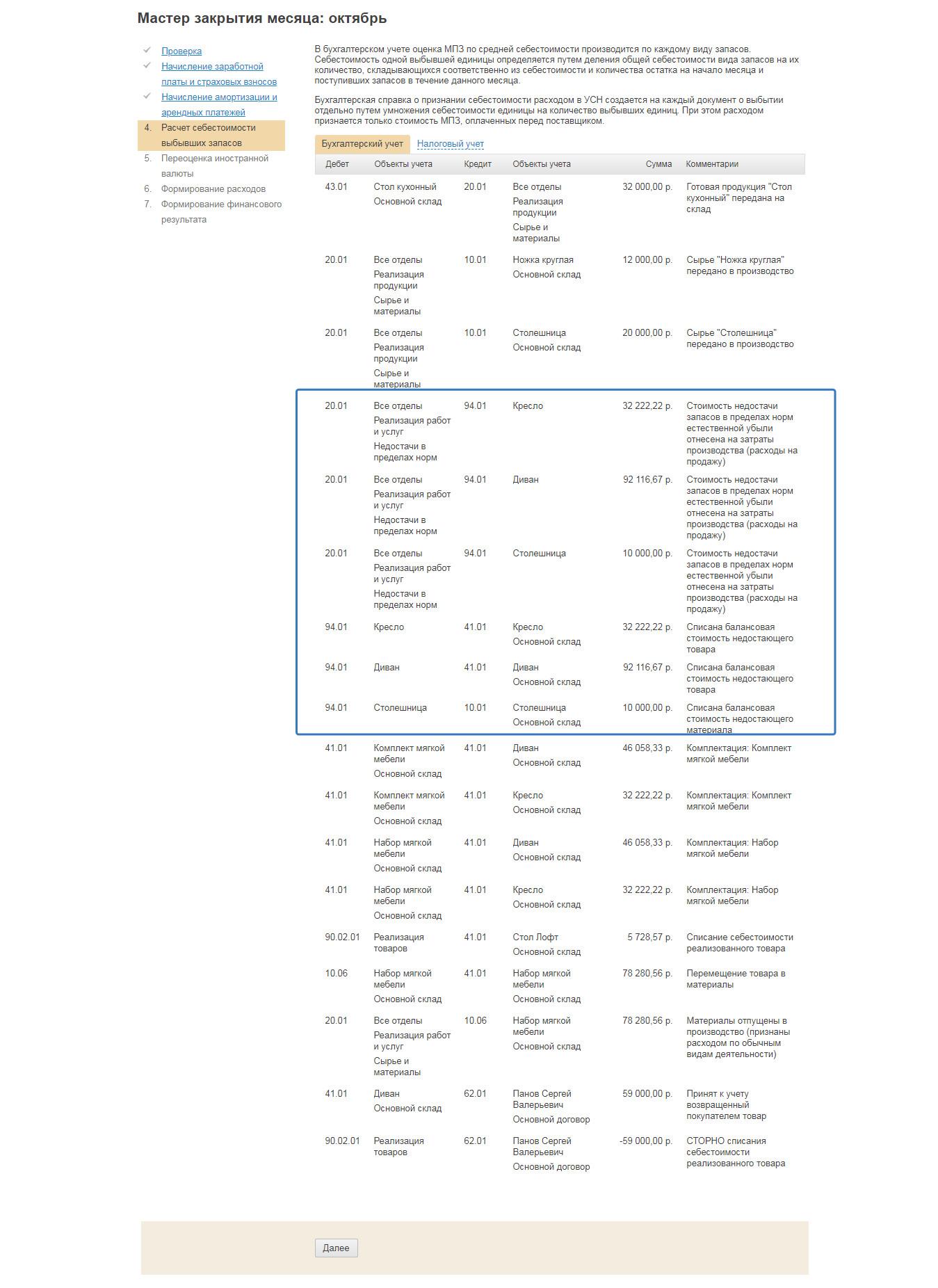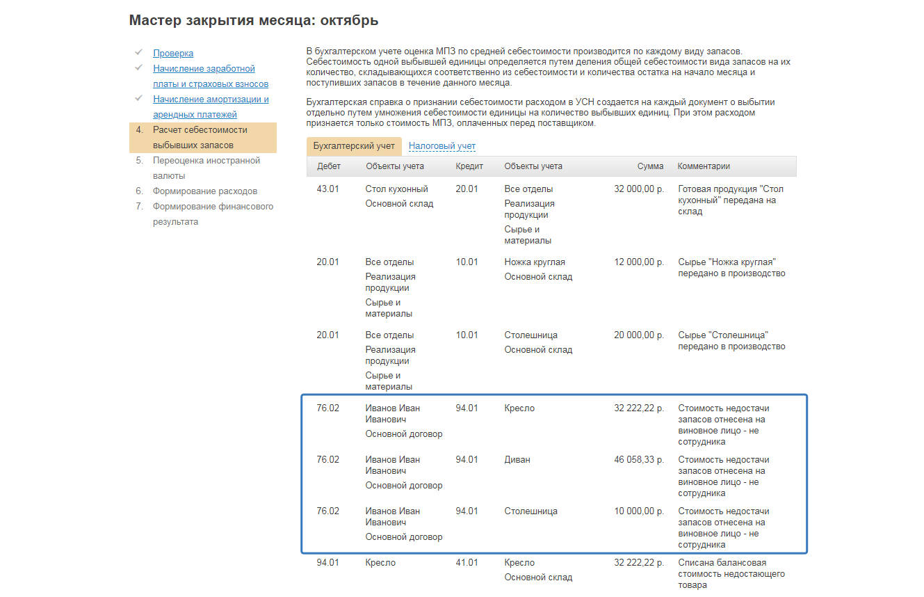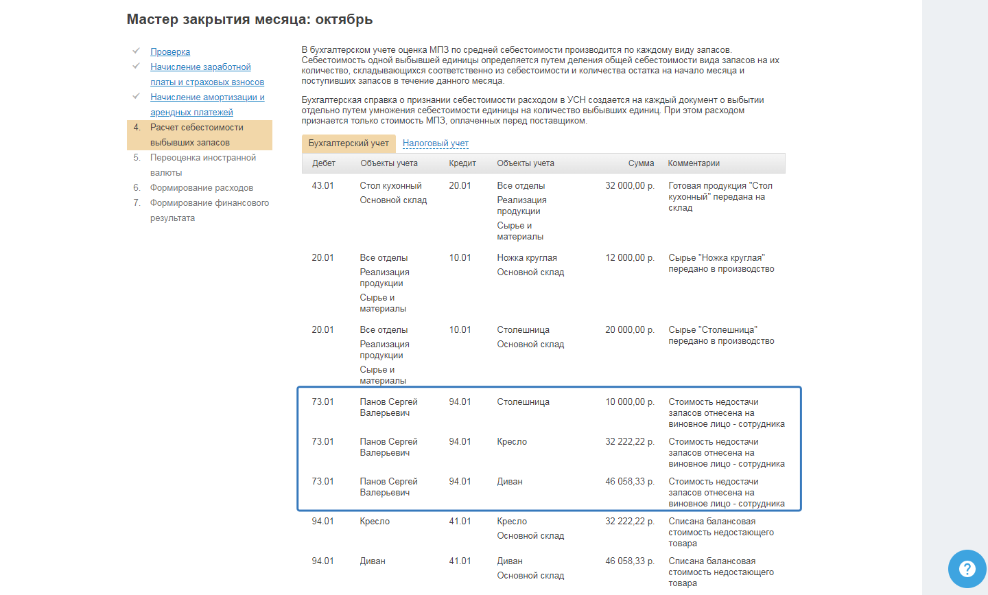 Если для недостачи указан тип «Виновное лицо (сотрудник)», проводки создаются при завершении закрытия месяца. Также отражаются в инвентаризации.