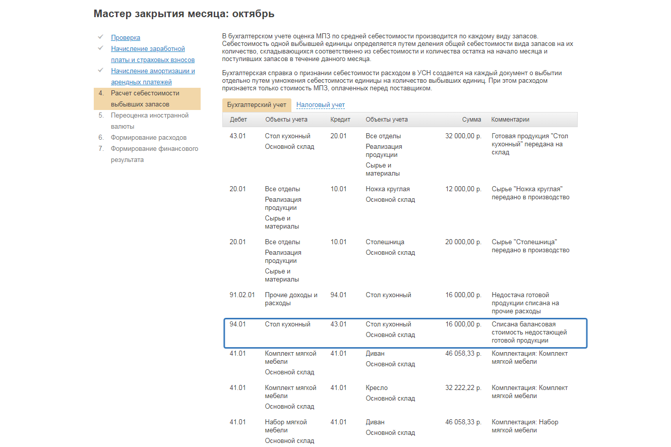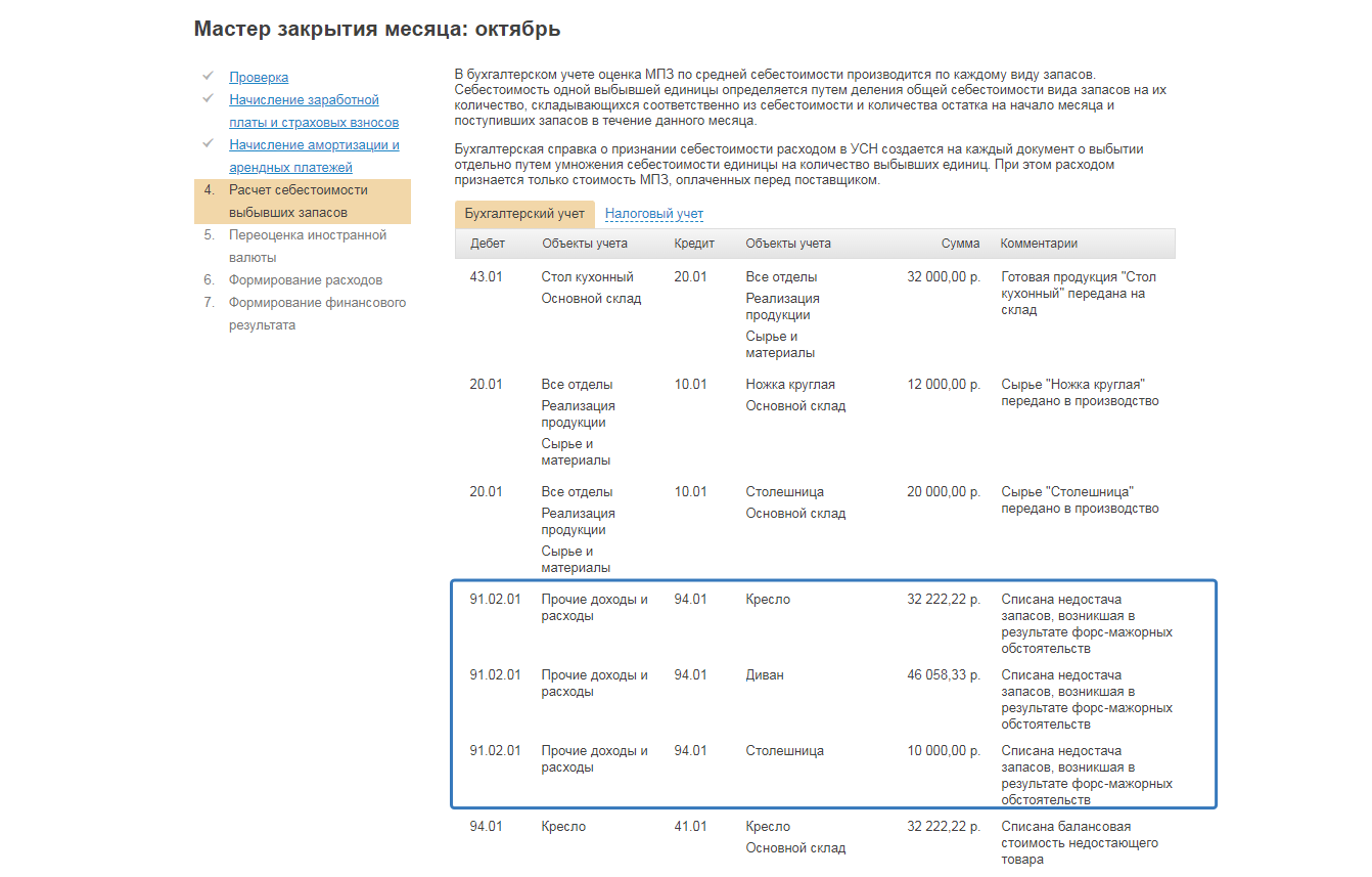 Если для недостачи указан тип «Форс-мажор», проводки создаются при завершении закрытия месяца. Также они отражаются в инвентаризации.
