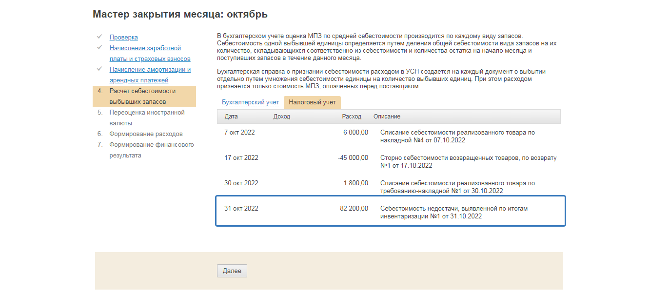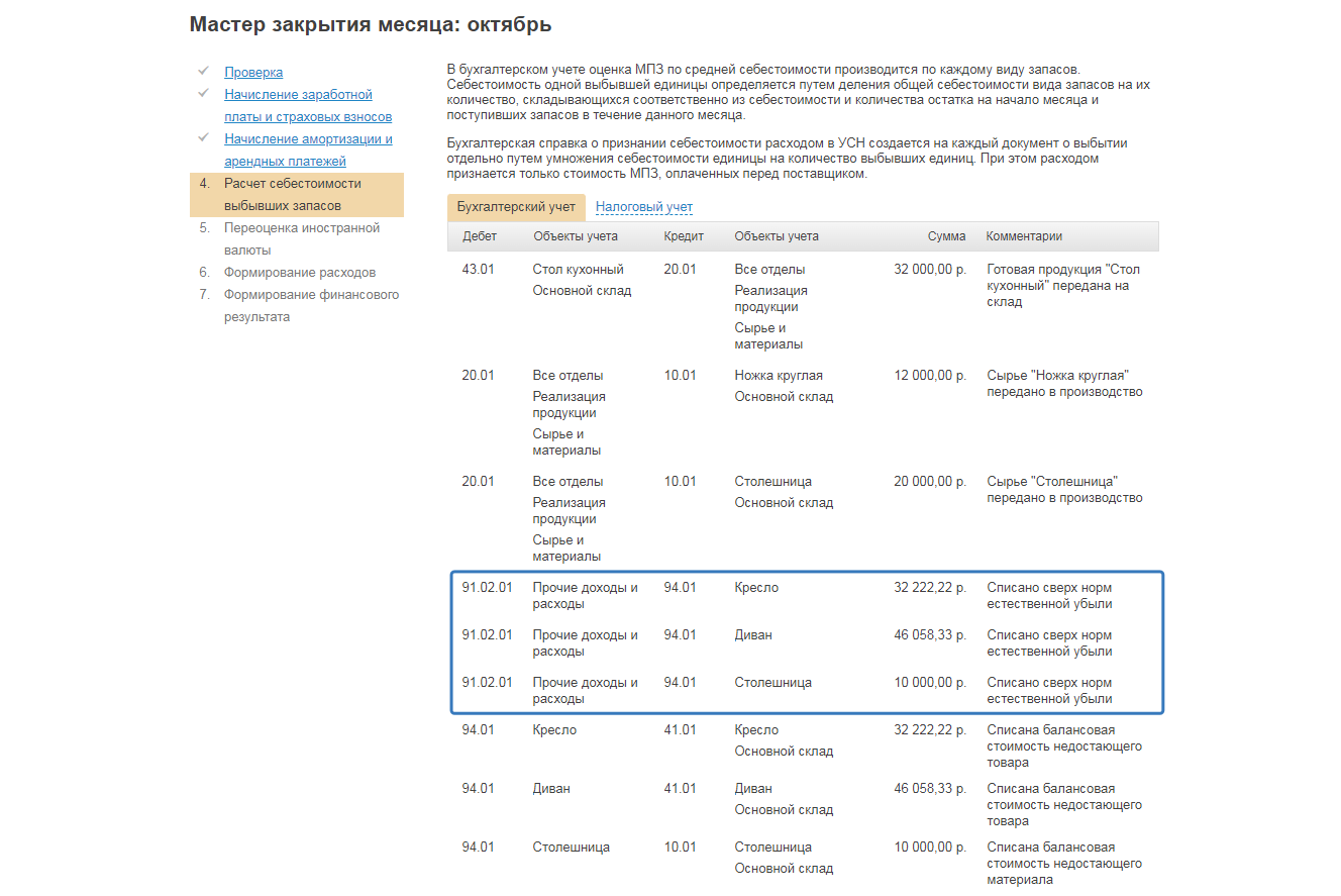 Если для недостачи указан тип «Сверх норм естественной убыли», проводки создаются при завершении закрытия месяца. Также отражаются в инвентаризации.