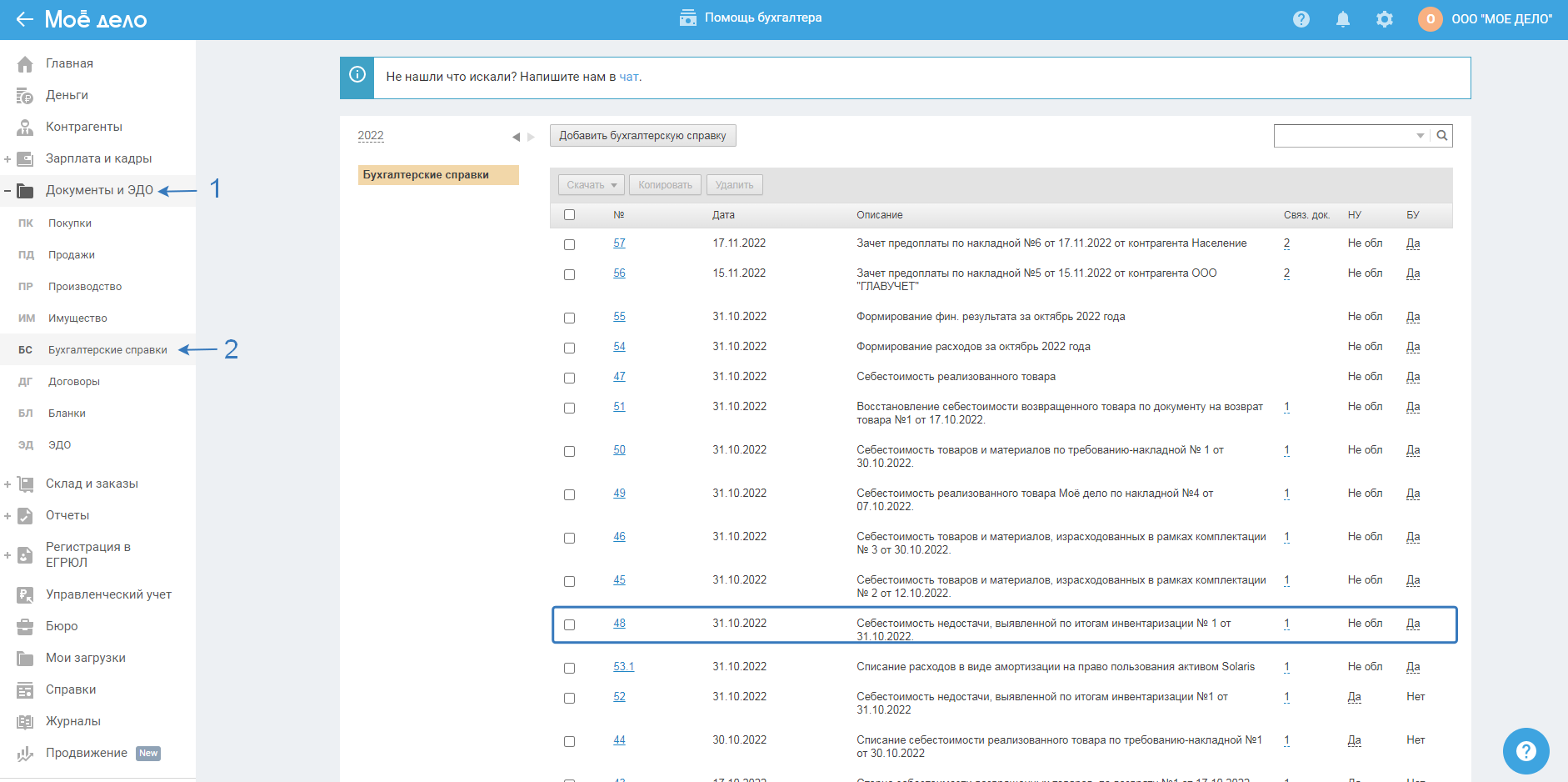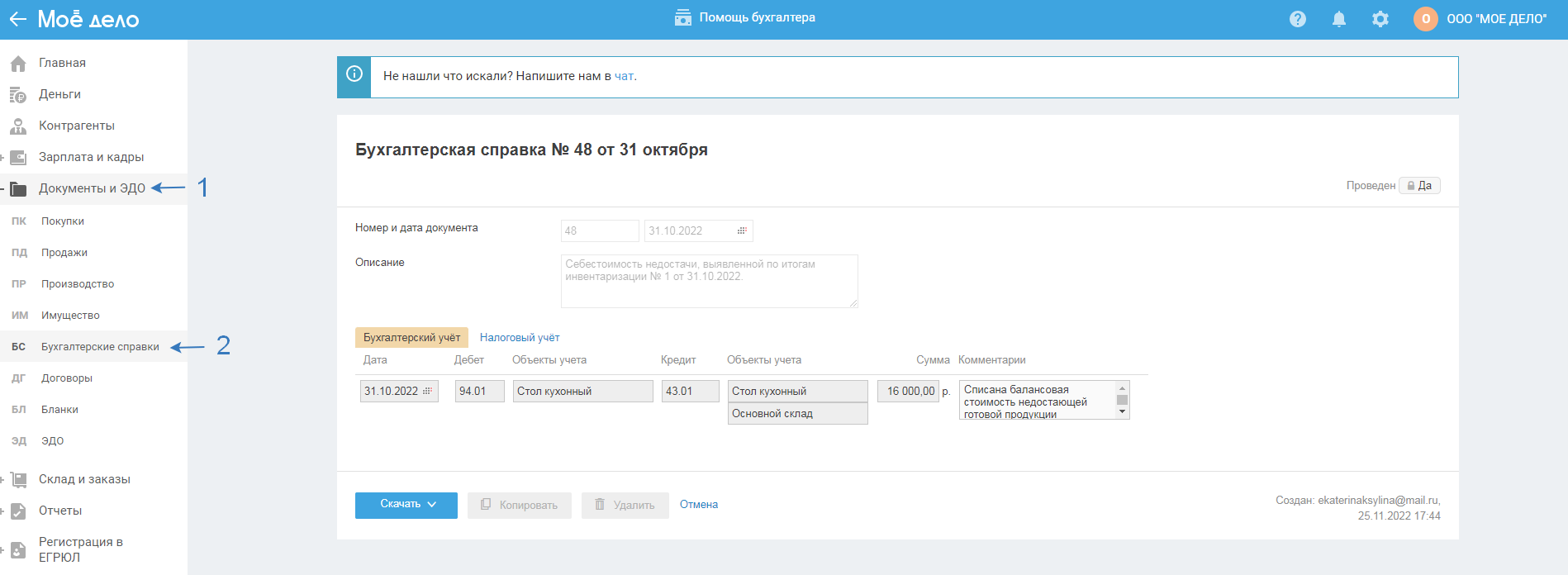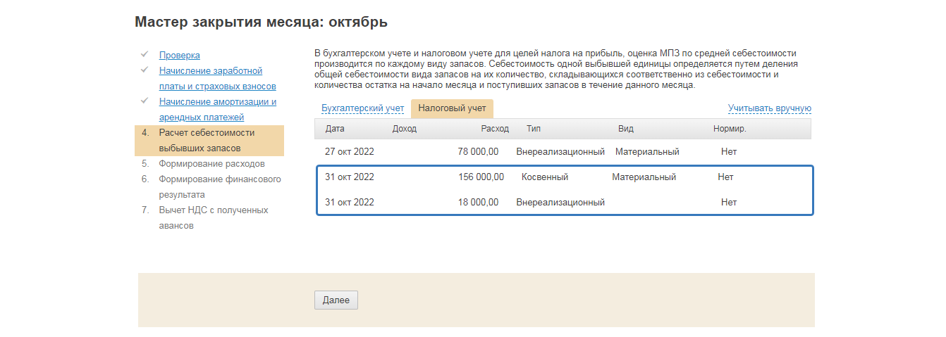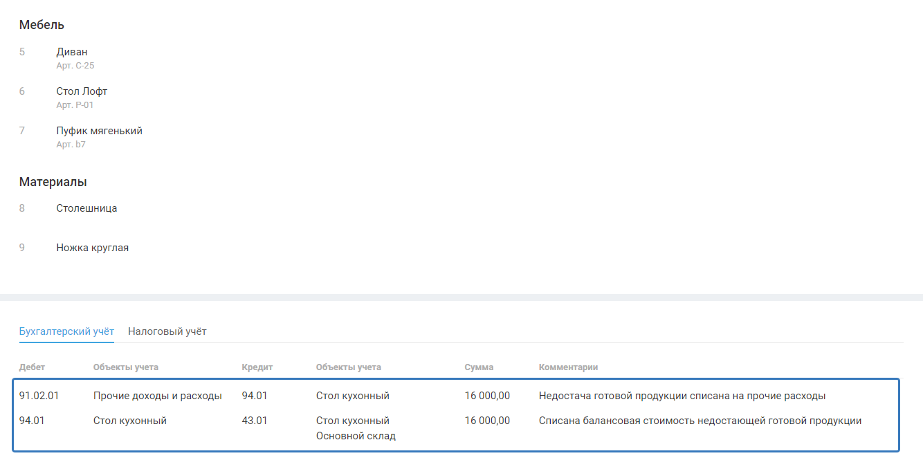1. Для товаров/материалов, если в «Причине недостачи» выбрано значение «В пределах норм естественной убыли», то создаётся расход «Косвенный», «Материальный» — на всю сумму недостачи. Привязывается к бух. справке о списании себестоимости.