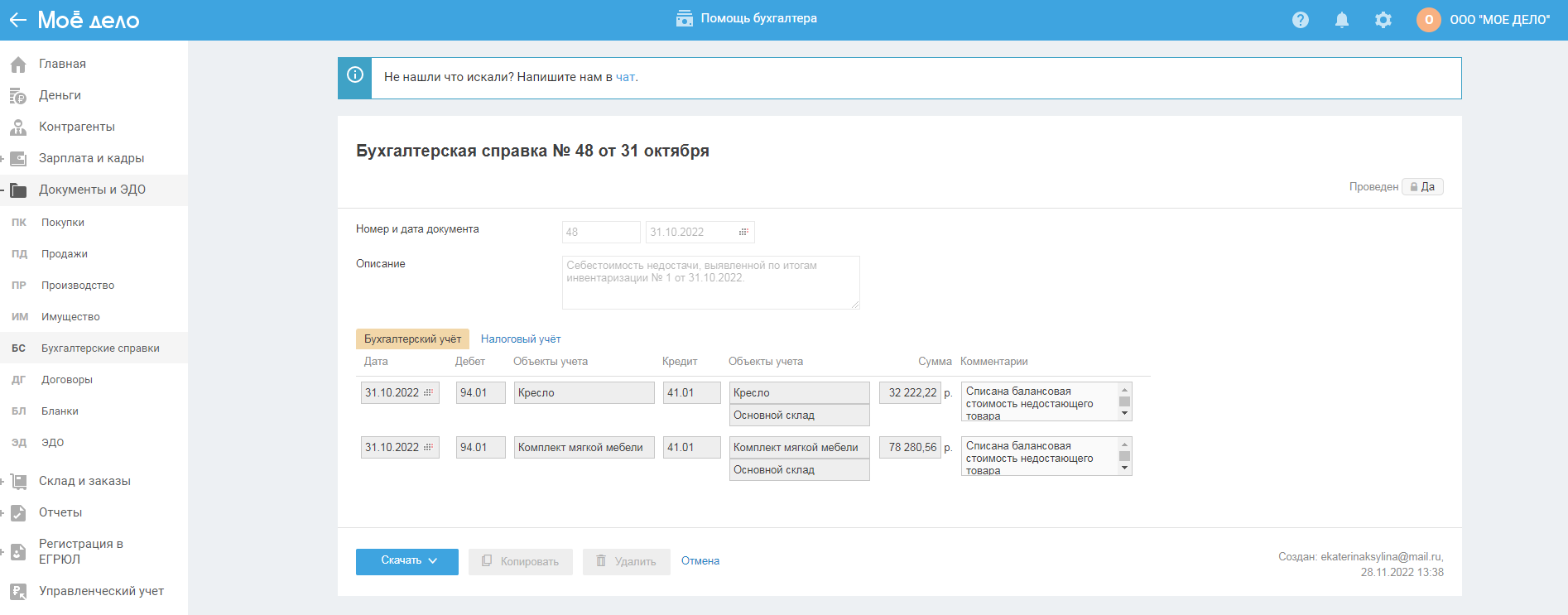 После сохранения инвентаризации проводки появляются в разделе «Отчёты, письма, требования, КУДИР — Аналитика».
