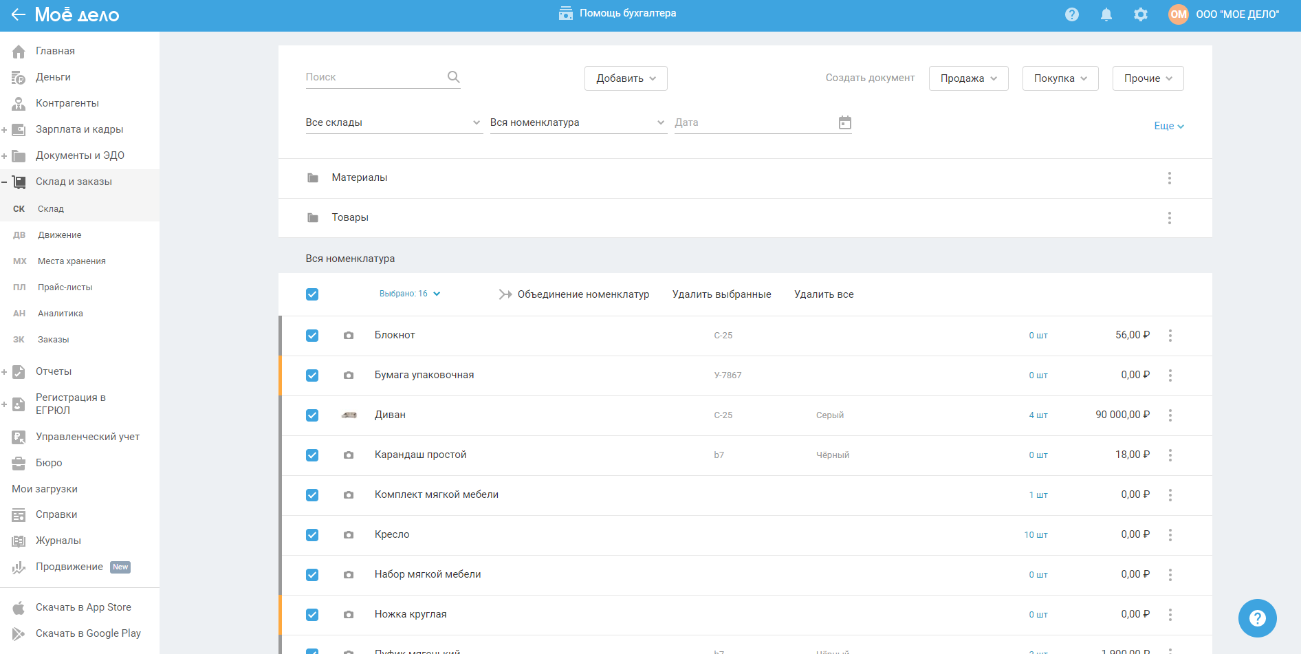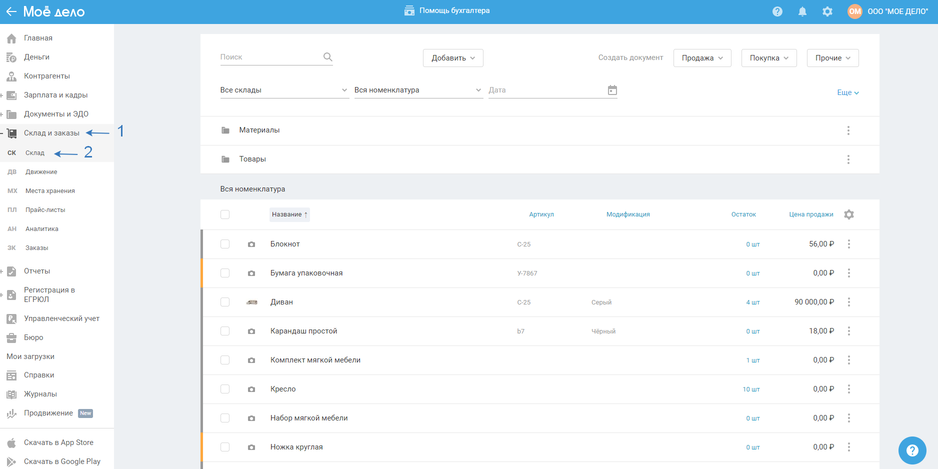 Для того чтобы удалить из сервиса номенклатуру товара (готовой продукции, материала — далее по тексту товары), перейдите в раздел «Склад и заказы — Склад»: