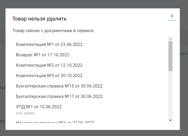 2. Если с удаляемым товаром есть связанные документы, тогда в появившемся окне будет указано, что «Товар нельзя удалить. Товар связан с документами в сервисе» и будет выведен список данных документов: