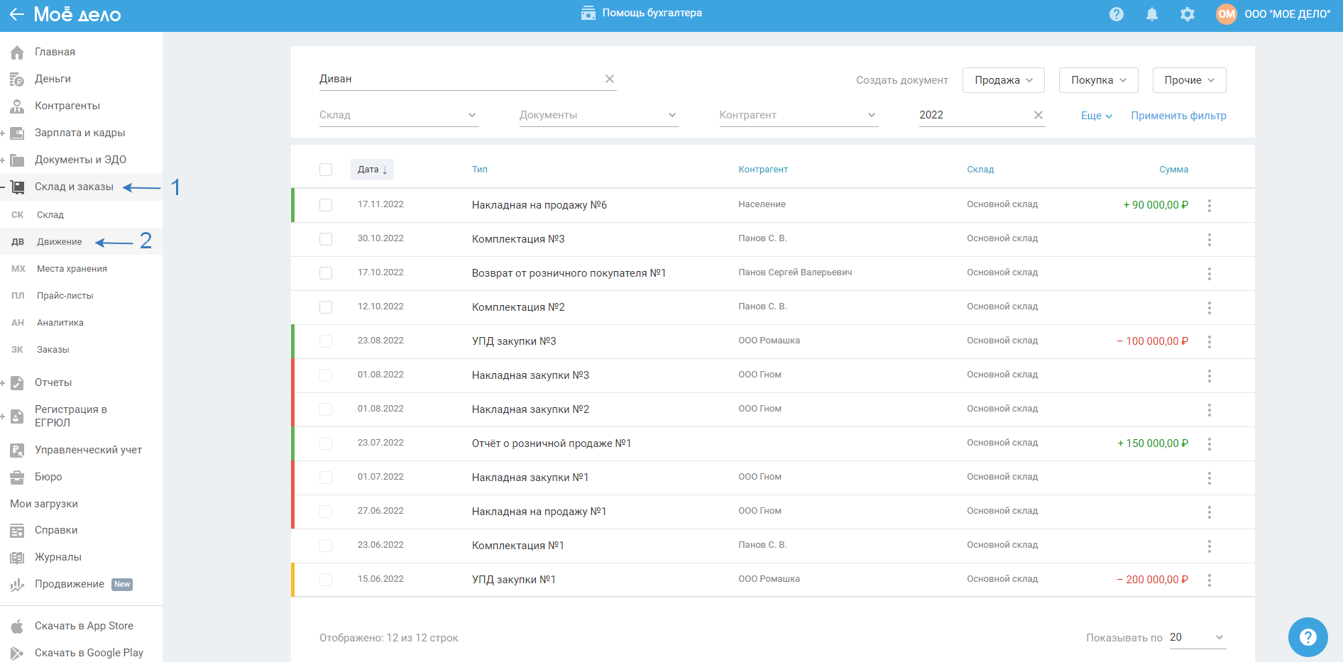 Также вы можете воспользоваться разделом «Склад и заказы — Движение»: введите в поисковой строке название товара и нажмите кнопку «Применить фильтр». В таблице появится список документов, в которых есть данный товар, отредактируйте документы (нажав на название документа откроется форма для его редактирования). Для того чтобы удалить номенклатуру, её необходимо удалить из всех документов.