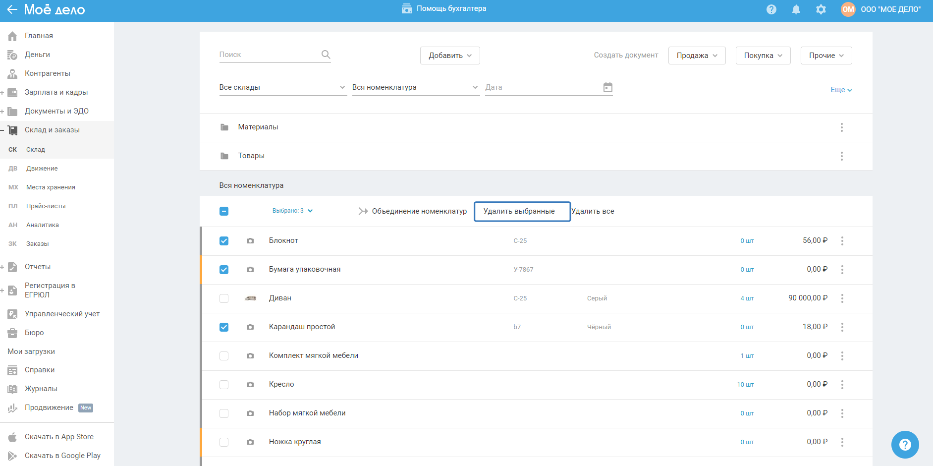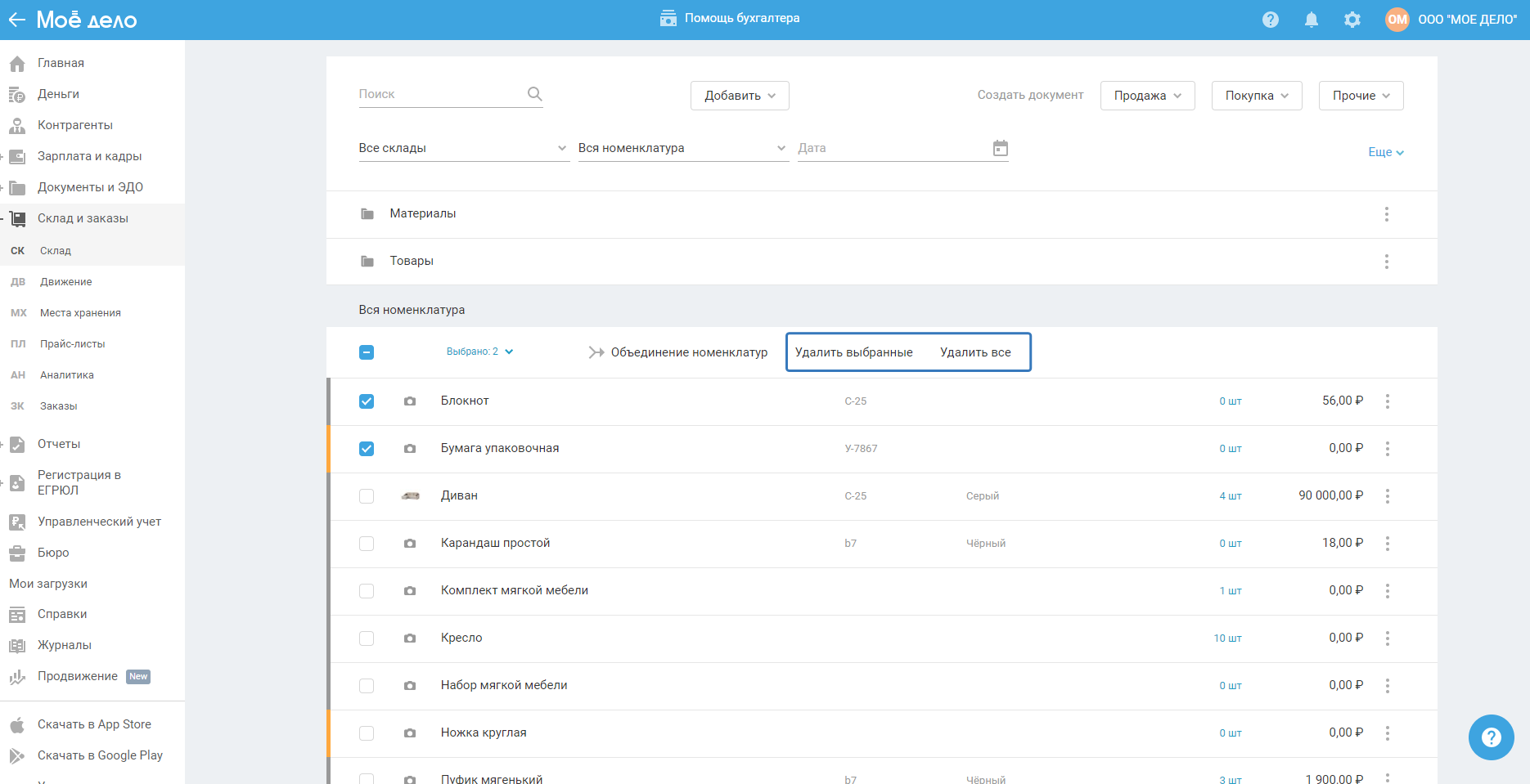 В разделе «Склад и заказы — Склад» при выберите более одной номенклатуры есть возможность удалить выбранные либо удалить все: