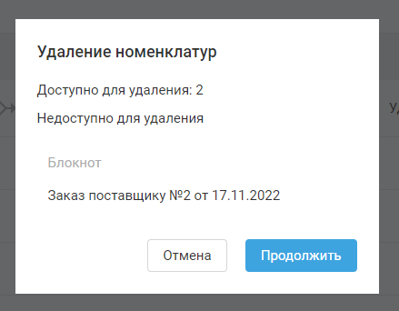Доступно для удаления: для удаления номенклатуры нажмите «Продолжить» .