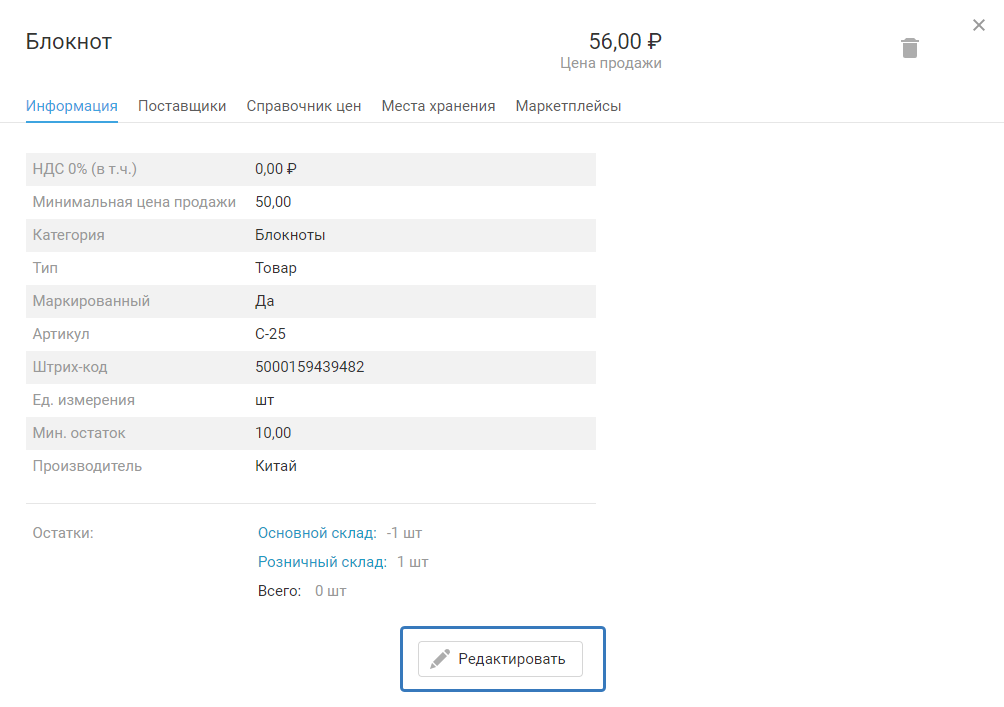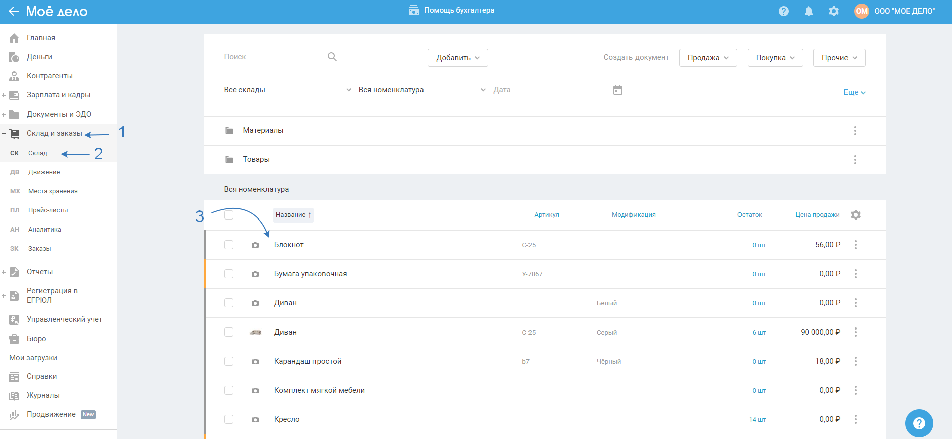 Выберите в меню «Склад и заказы — Склад» и нажмите на наименование номенклатуры, по которой необходимо сменить тип: