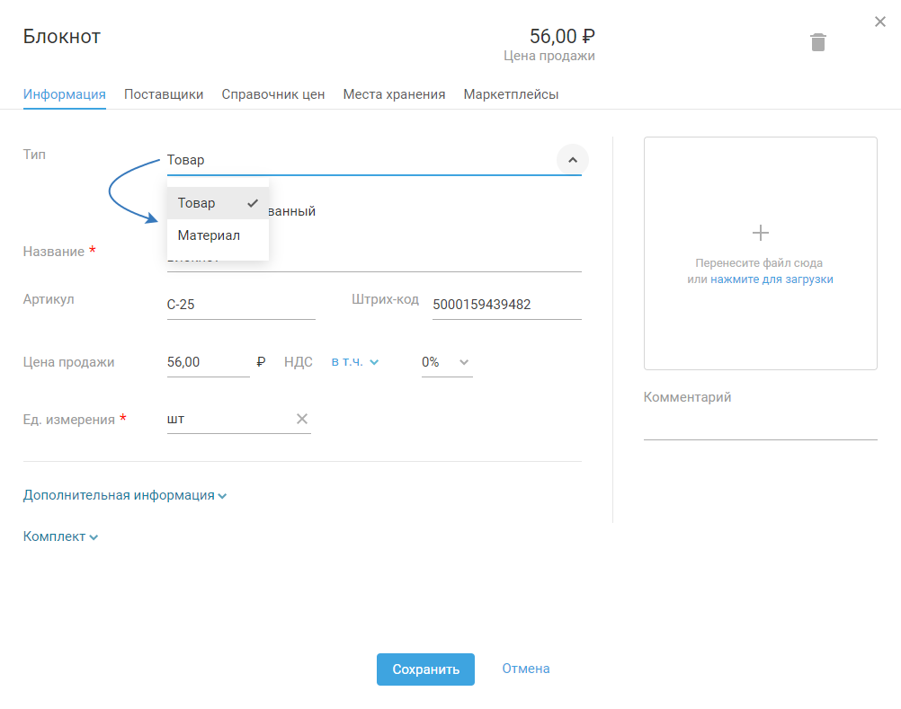 Если вы по ошибке указали неверный тип номенклатуры товара/материала, его можно изменить.