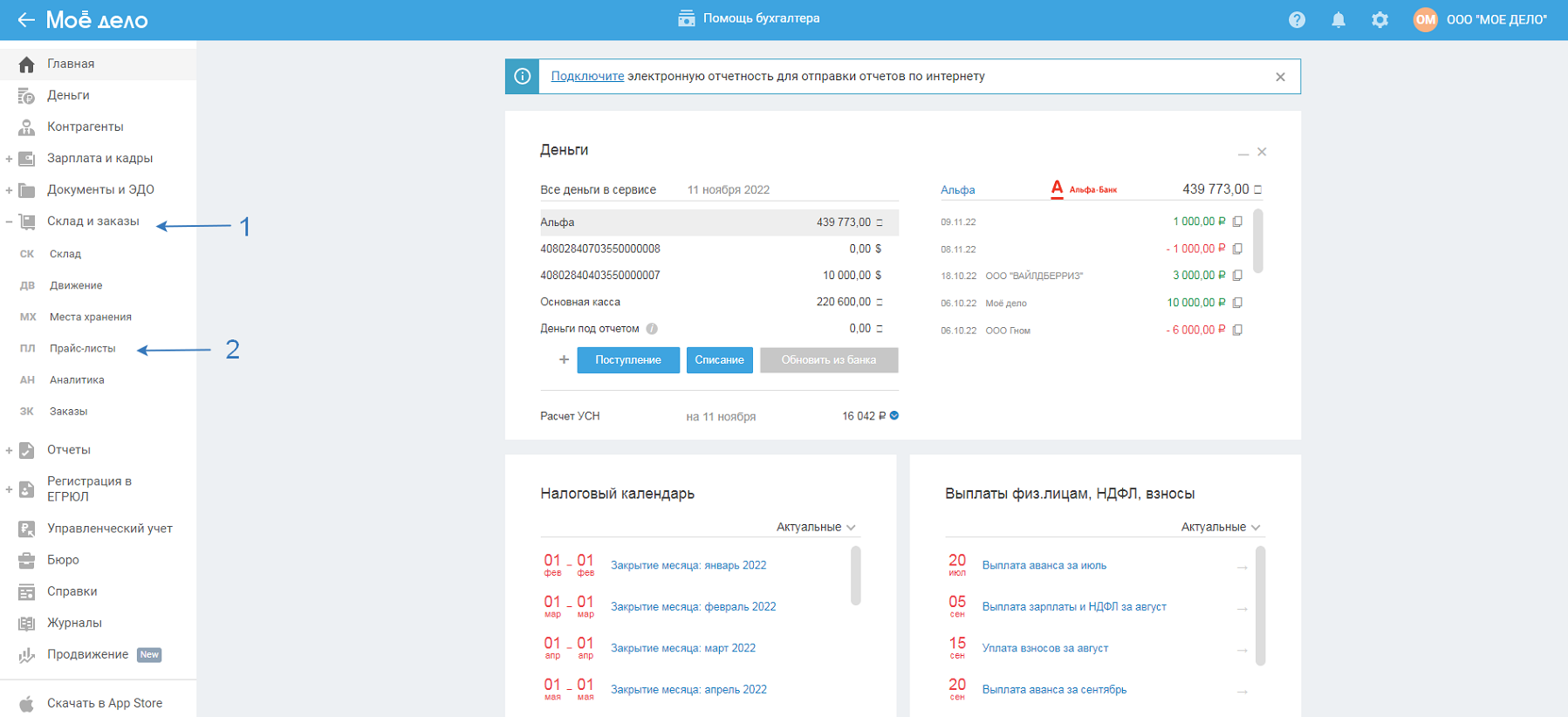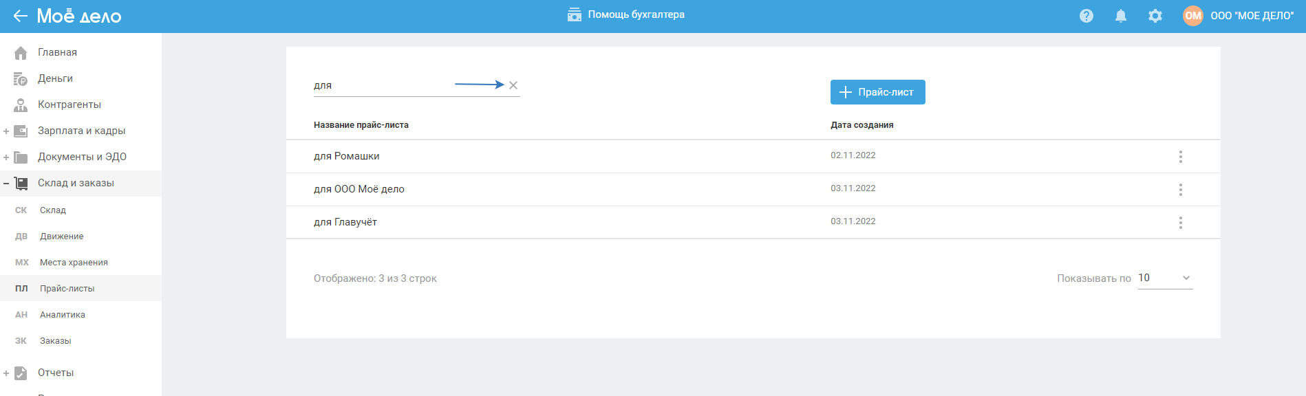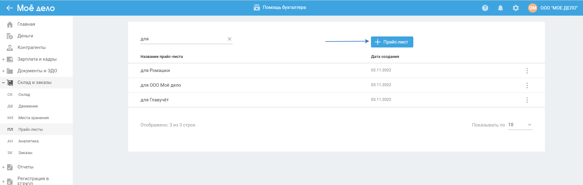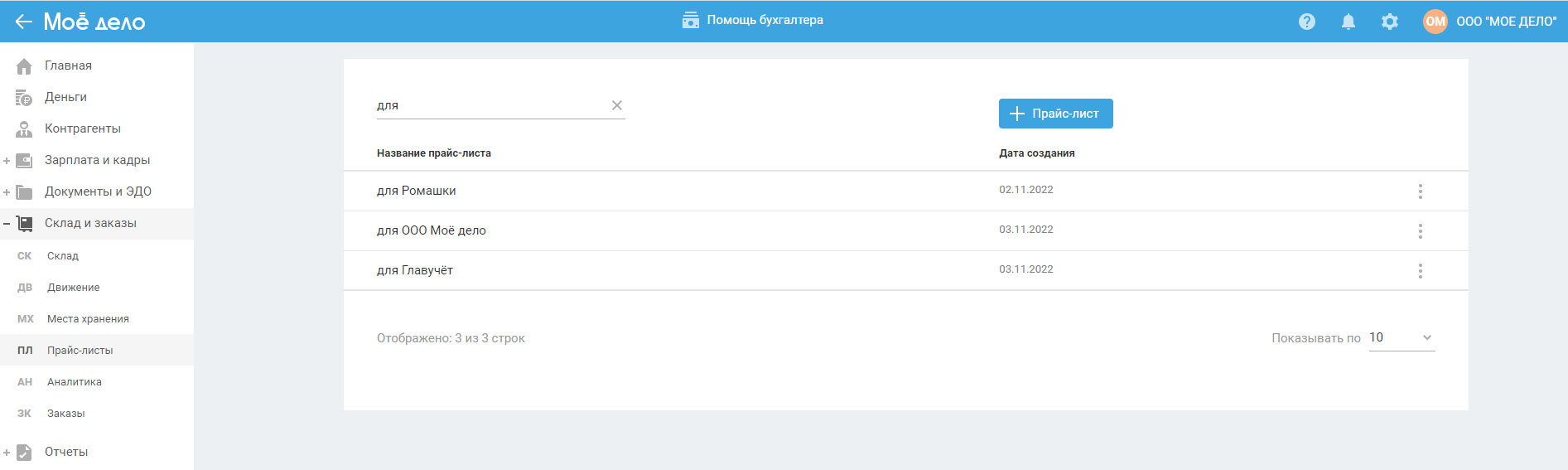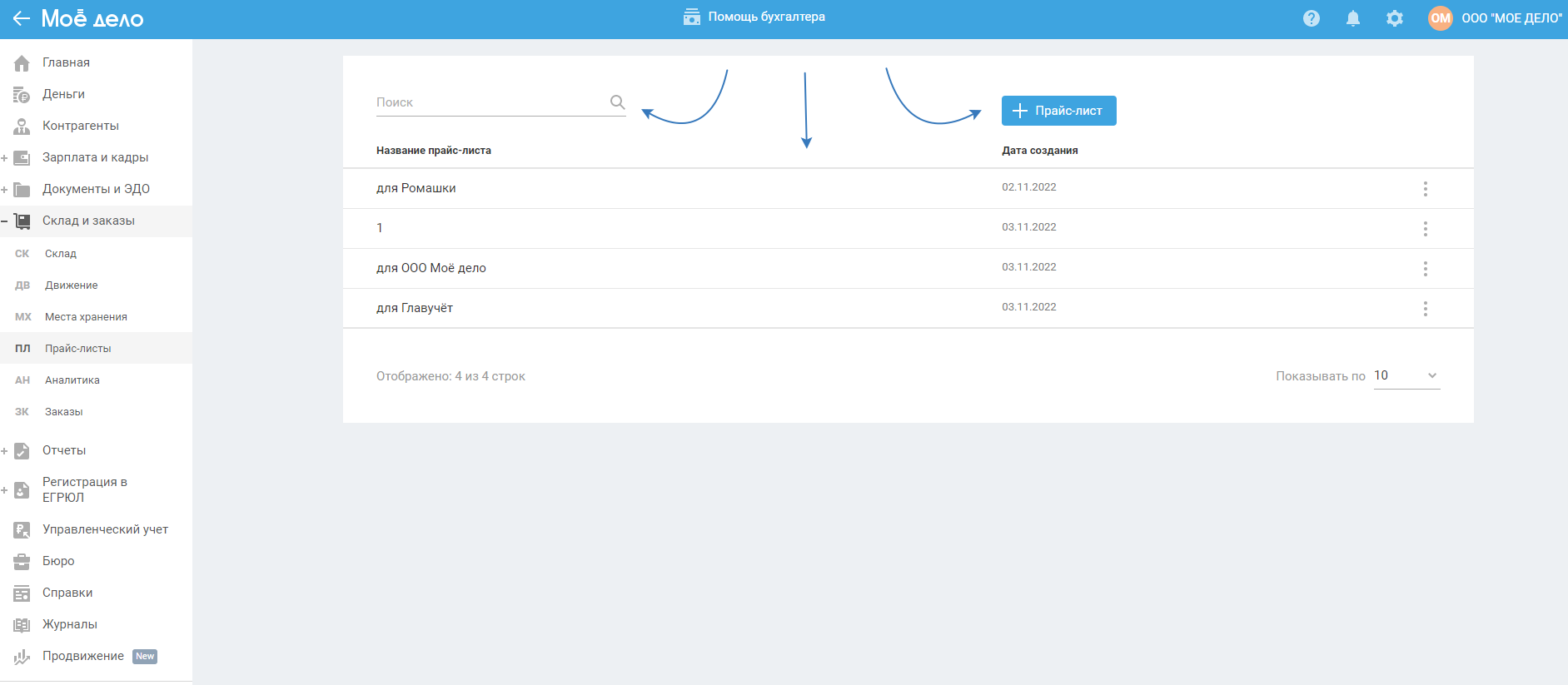 Для перехода в раздел выберите в основном меню слева пункт «Склад и заказы — Прайс-листы»: