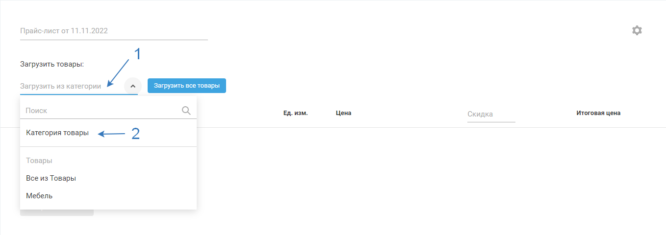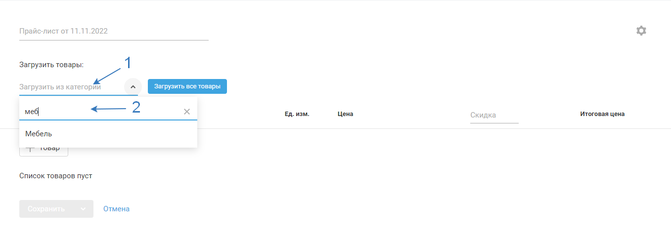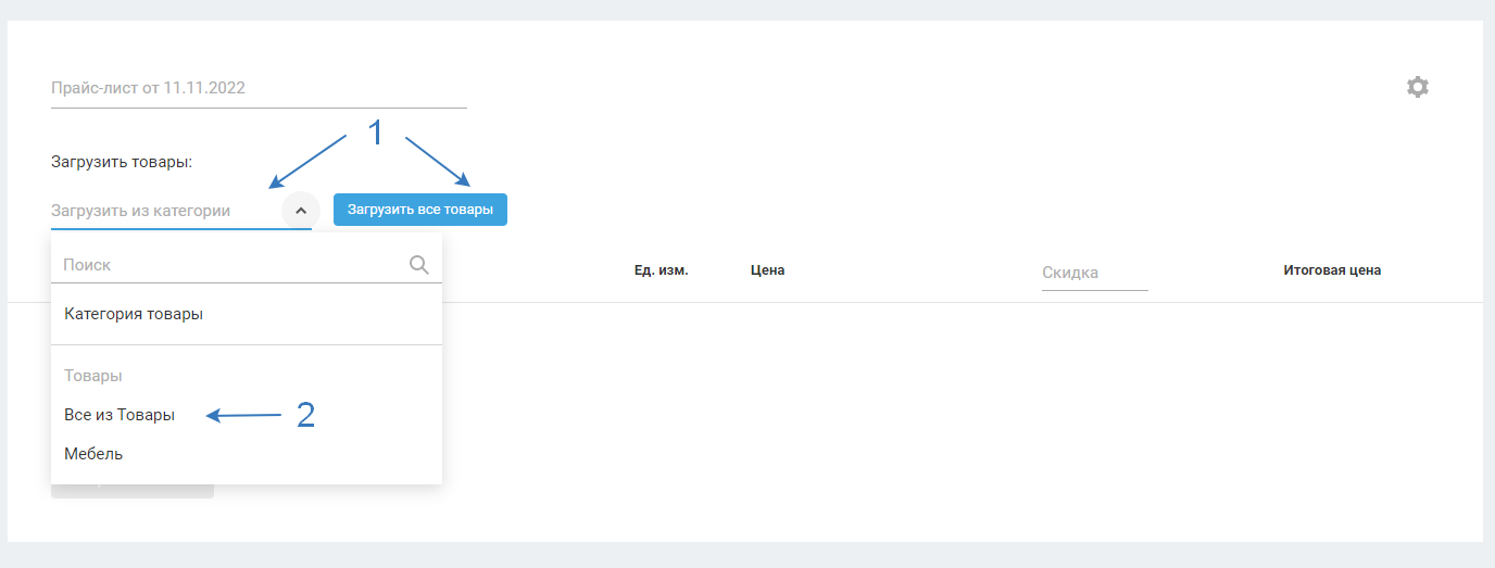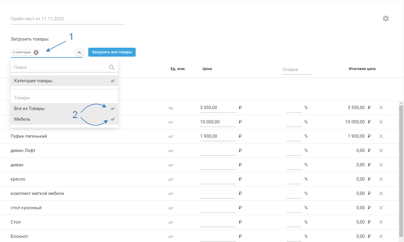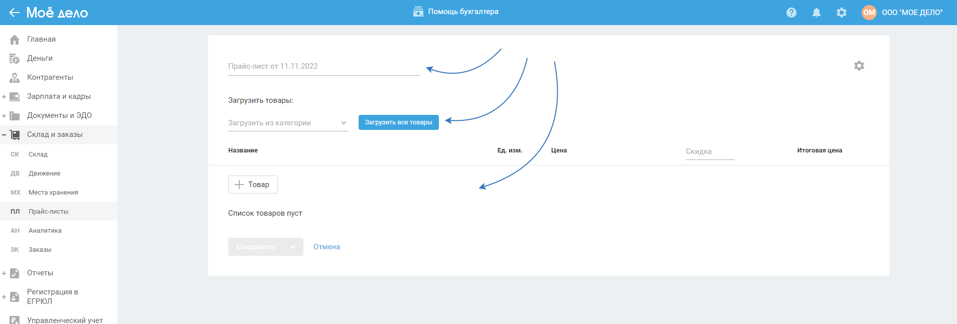 В открывшемся окне укажите название прайс-листа и загрузите товары: