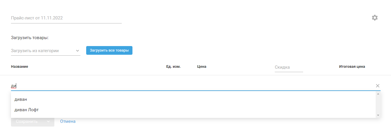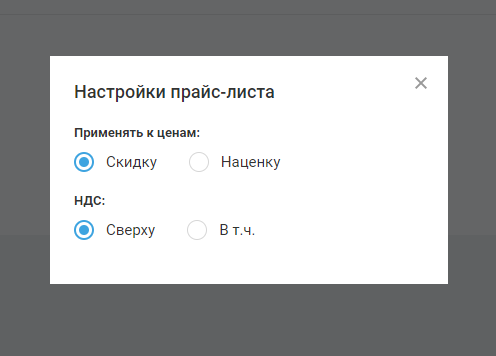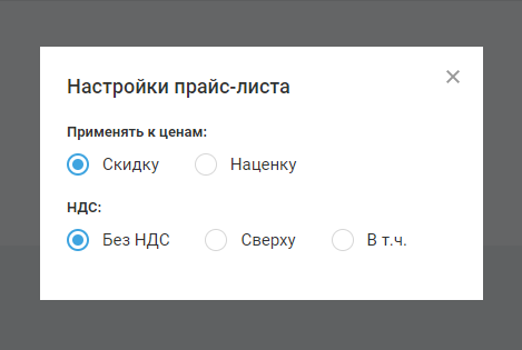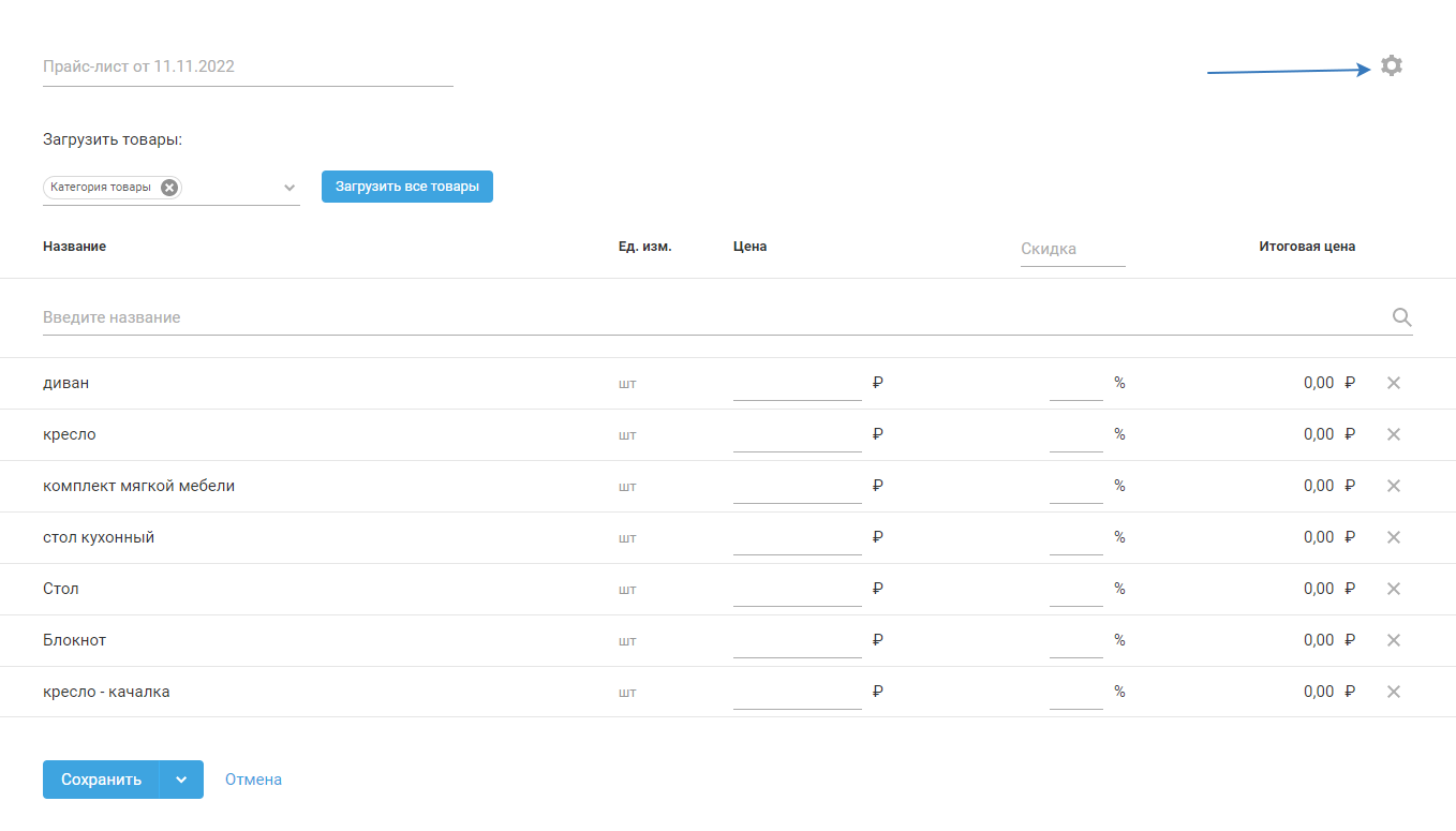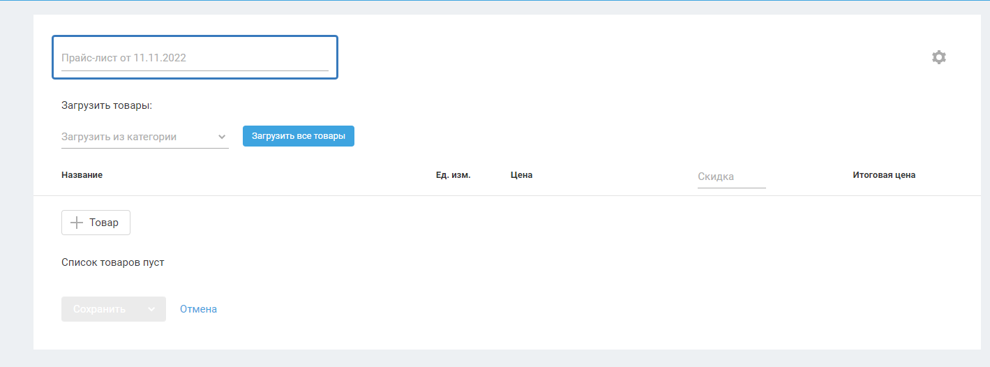 Скидка/наценка — графа отображается в зависимости от настроек. Для выбора настройки нажмите на значок в виде шестерёнки в правом верхнем углу формы создания прайс-листа: