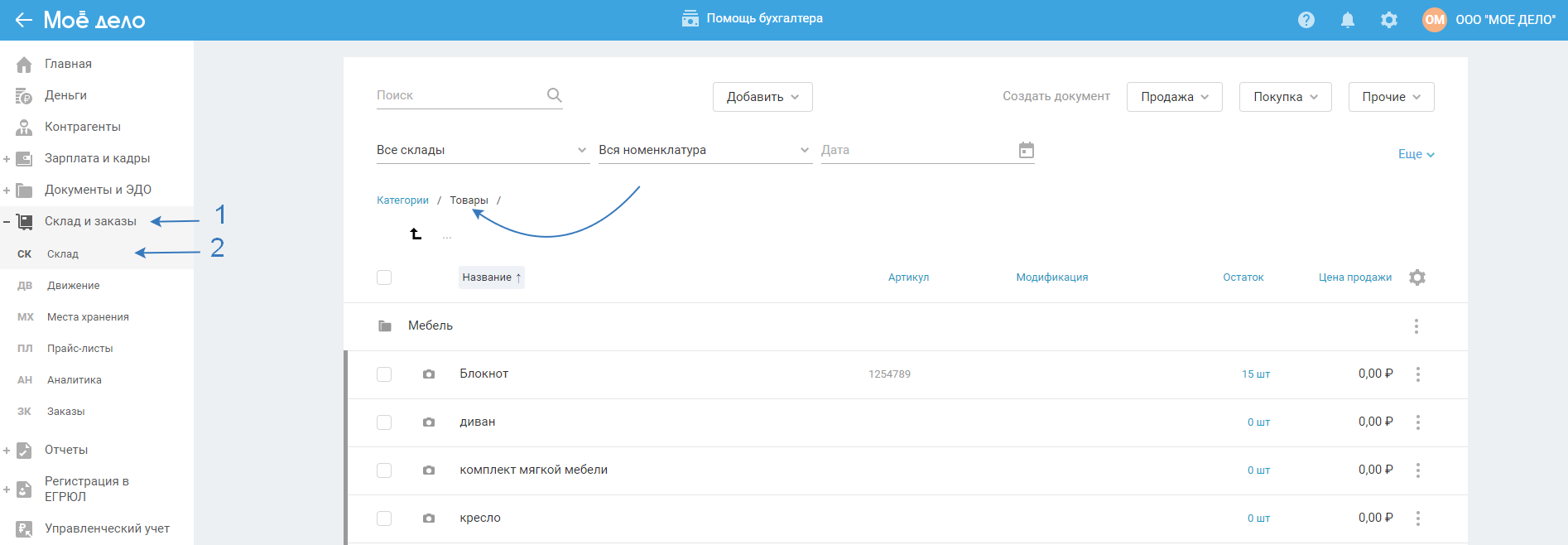 В данном варианте не учитывается номенклатура, относящаяся к подкатегориям, созданным в разделе «Склад и заказы — Склад»: