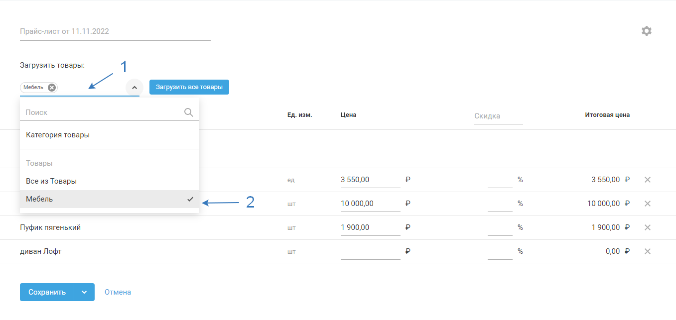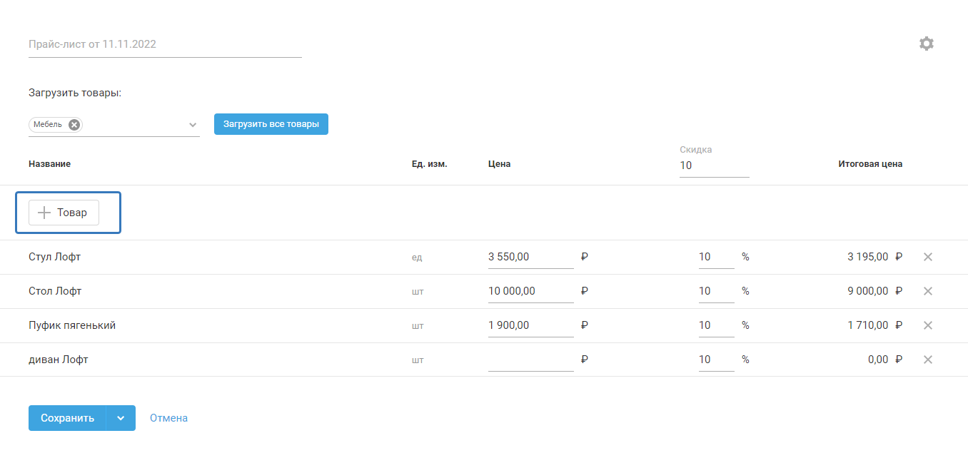 - Сохранить — вы будете перенаправлены в раздел «Документы — Прайс-листы».